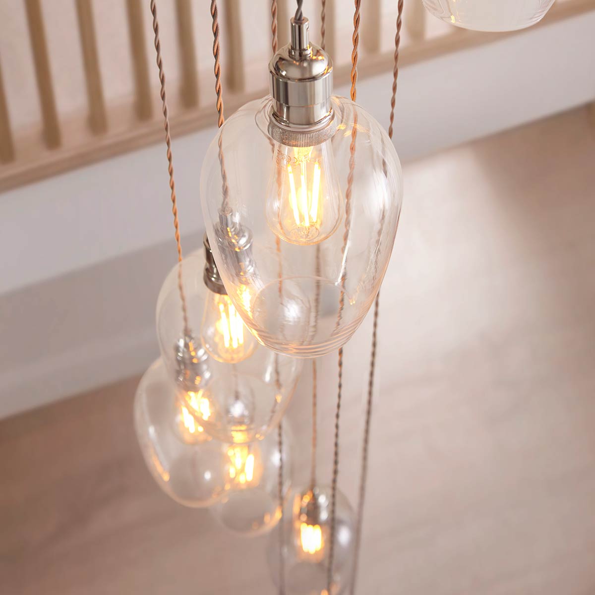 This long drop cascade ceiling pendant has so much to love. The large ceiling mount is flawlessly finished in polished nickel and the optically clear goblet shades allow maximum light through. At 3.4m high, this fitting needs a double height space such as a stairwell, vaulted room, or hotel foyer. Please ensure that it is suitable for your installation prior to purchase.