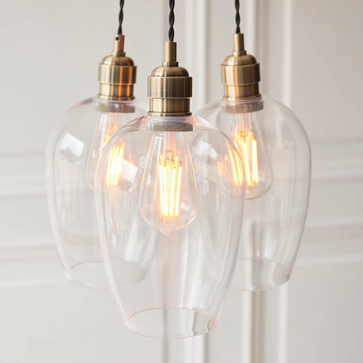 This wonderful cluster ceiling pendant has so much to love. The ceiling mount is flawlessly finished in antique brass plate and the optically clear goblet shades allow maximum light through. At 1.1m high, this fitting needs a high ceiling or placed over a dining table. Please ensure that it is suitable for your installation prior to purchase.