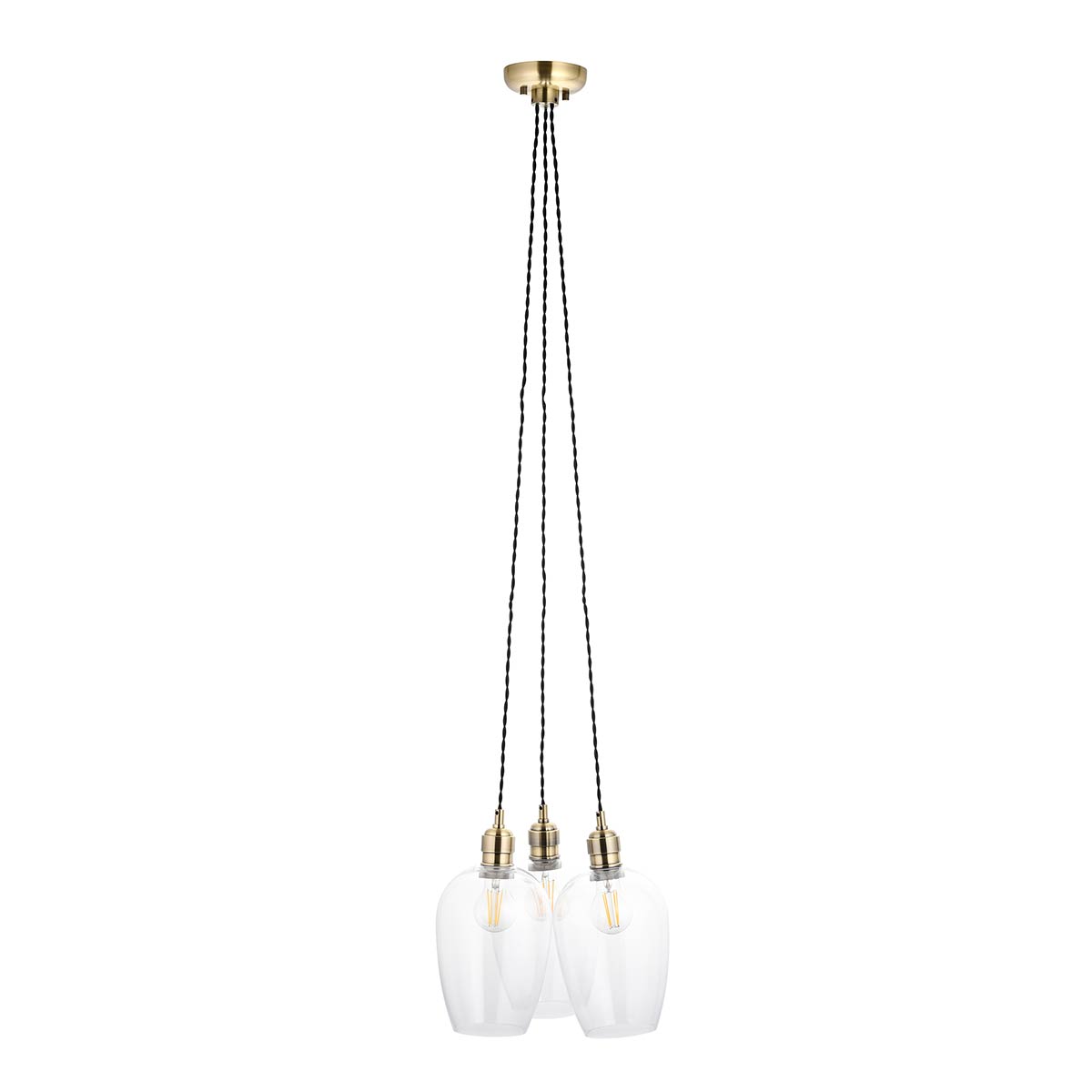 This 3 light cluster pendant in antique brass with clear glass goblet shades is an understated classic. Featuring three beautiful clear glass goblet shades suspended from twisted grey fabric cable attached to a circular antique brass plated ceiling mount. Each shade is attached by a vintage style lamp holder with a knurled locking ring.