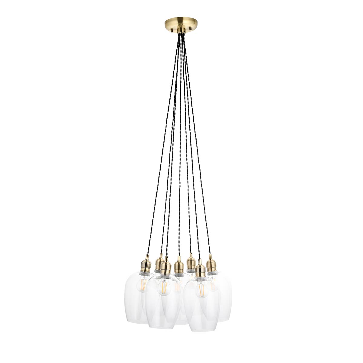 This 7 light cluster pendant in antique brass with clear glass goblet shades is an understated classic. Featuring seven beautiful clear glass goblet shades suspended from twisted grey fabric cable attached to a circular antique brass plated ceiling mount. Each shade is attached by a vintage style lamp holder with a knurled locking ring.
