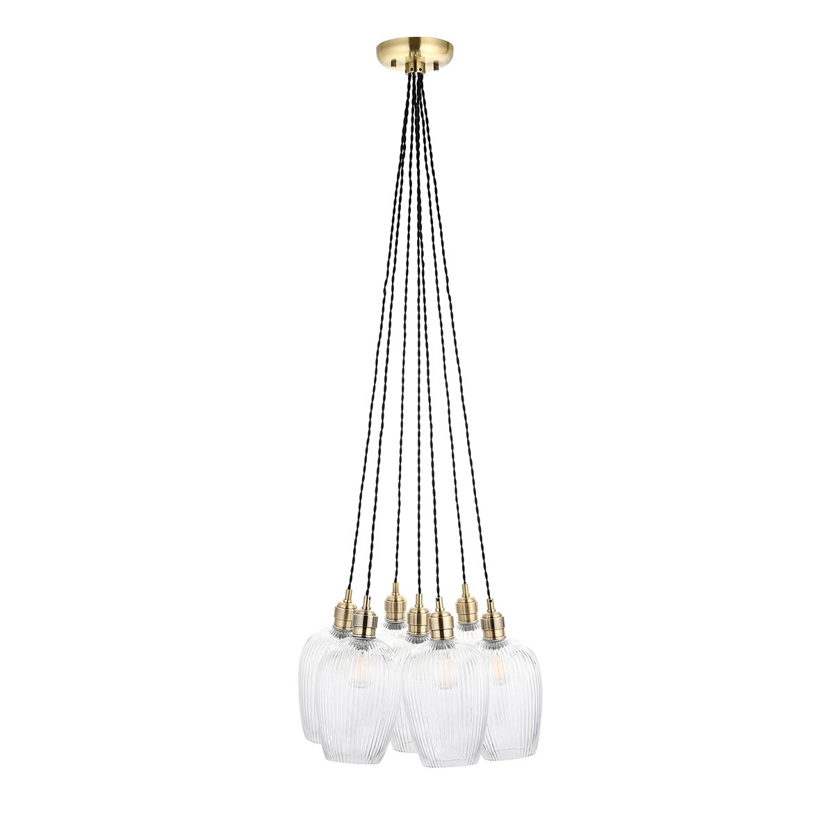 This 7 light cluster pendant in antique brass with ribbed glass goblet shades is an understated classic. Featuring seven beautiful clear ribbed glass goblet shades suspended from twisted grey fabric cable attached to a circular antique brass plated ceiling mount. Each shade is attached by a vintage style lamp holder with a knurled locking ring.
