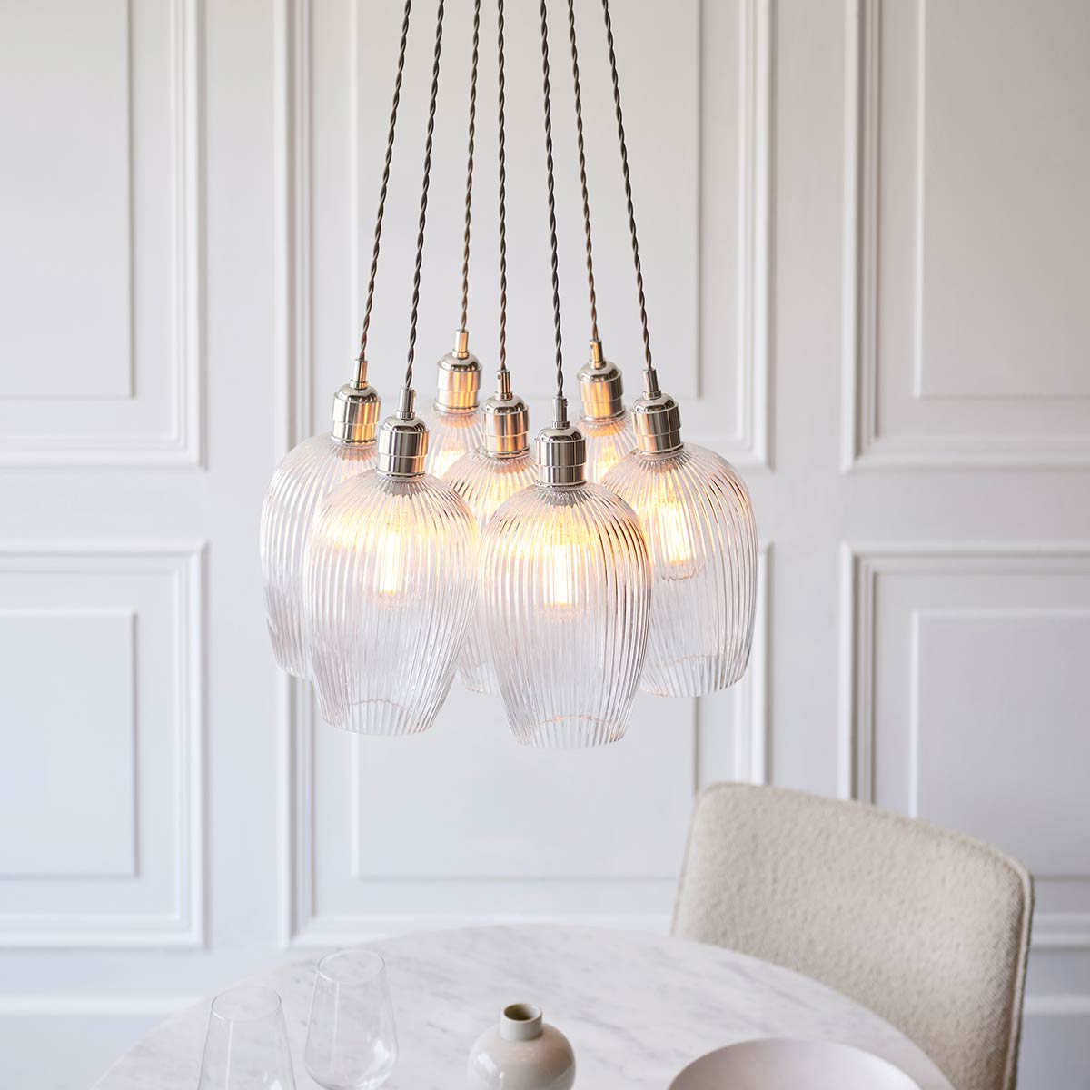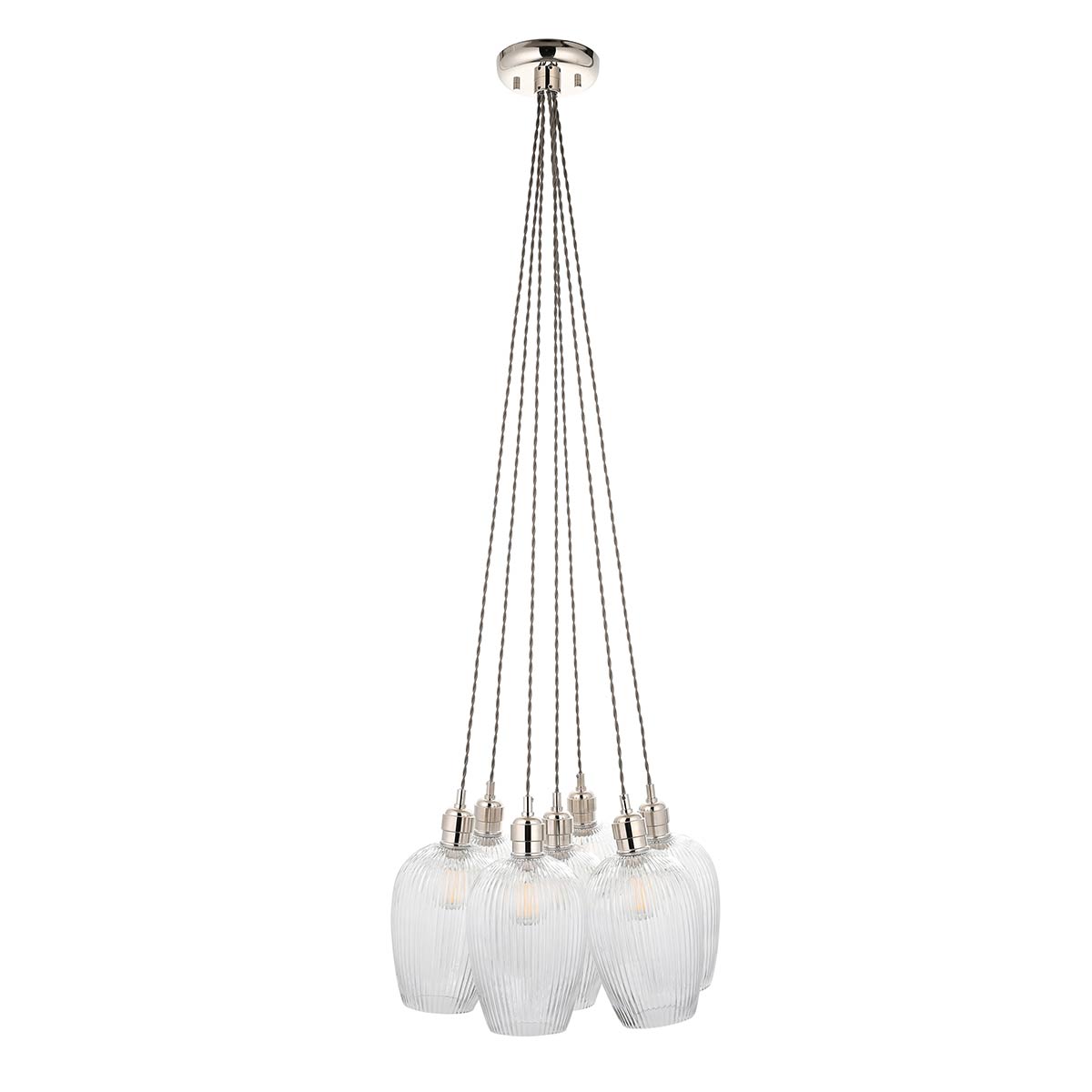 This 7 light cluster pendant in polished nickel with ribbed glass goblet shades is an understated classic. Featuring seven beautiful clear ribbed glass goblet shades suspended from twisted grey fabric cable attached to a circular bright nickel plated ceiling mount. Each shade is attached by a vintage style lamp holder with a knurled locking ring.