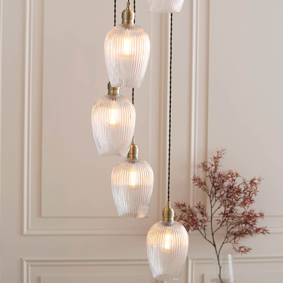 7 Light Stairwell Pendant in Antique Brass with Ribbed Glass