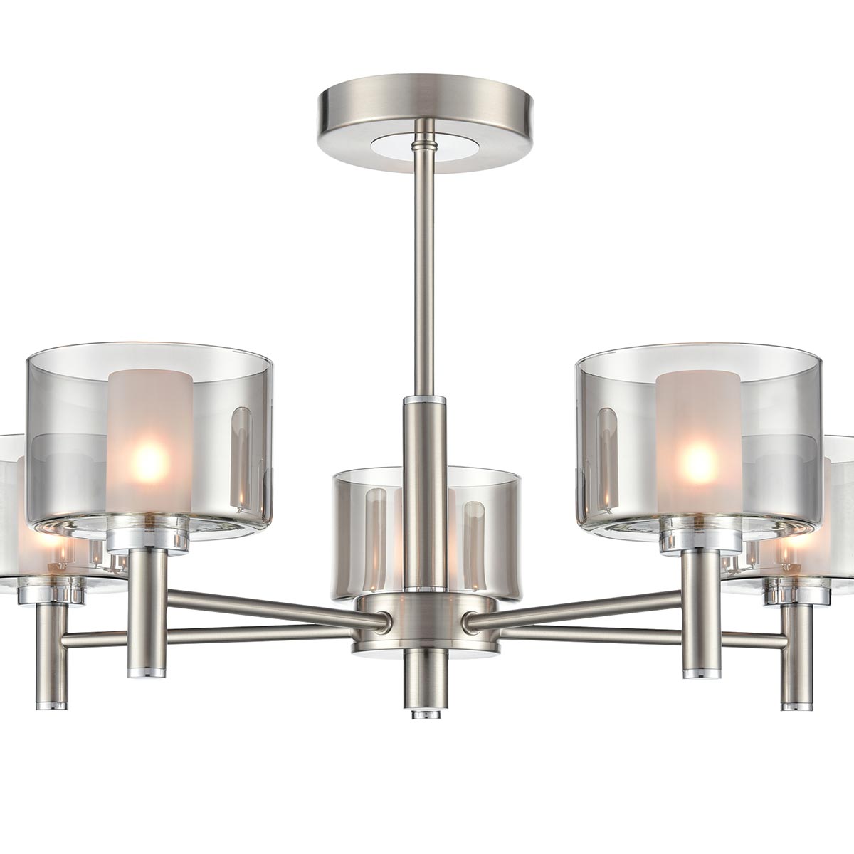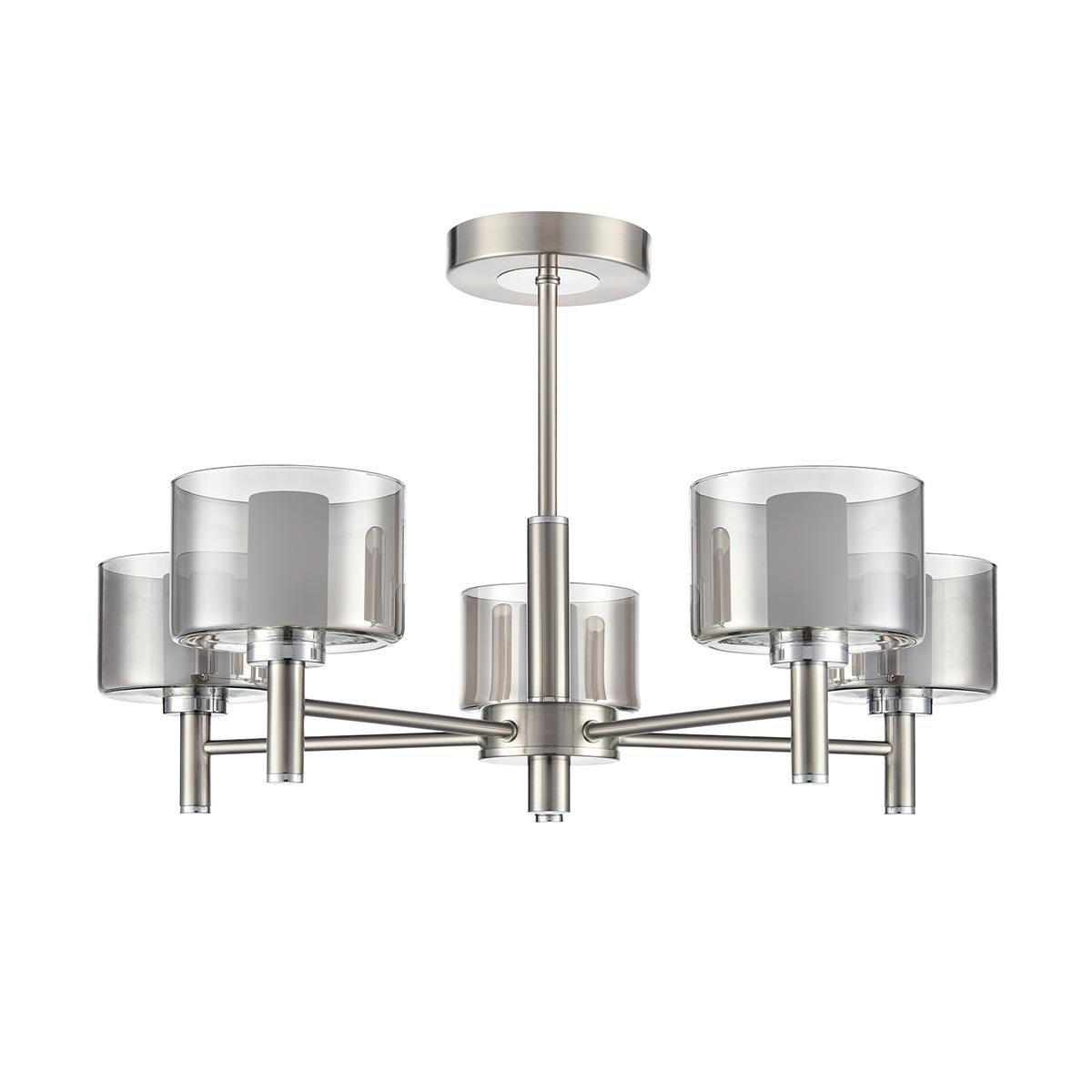 Introducing the Argento 5 light semi flush ceiling light in satin nickel with smoked and frosted glass shades from Franklite. Designed for rooms with a low ceiling, the Argento features a circular ceiling mount, short drop rod and five straight arms. Each arm features a smoked glass outer shade and frosted inner that diffuse the light beautifully.