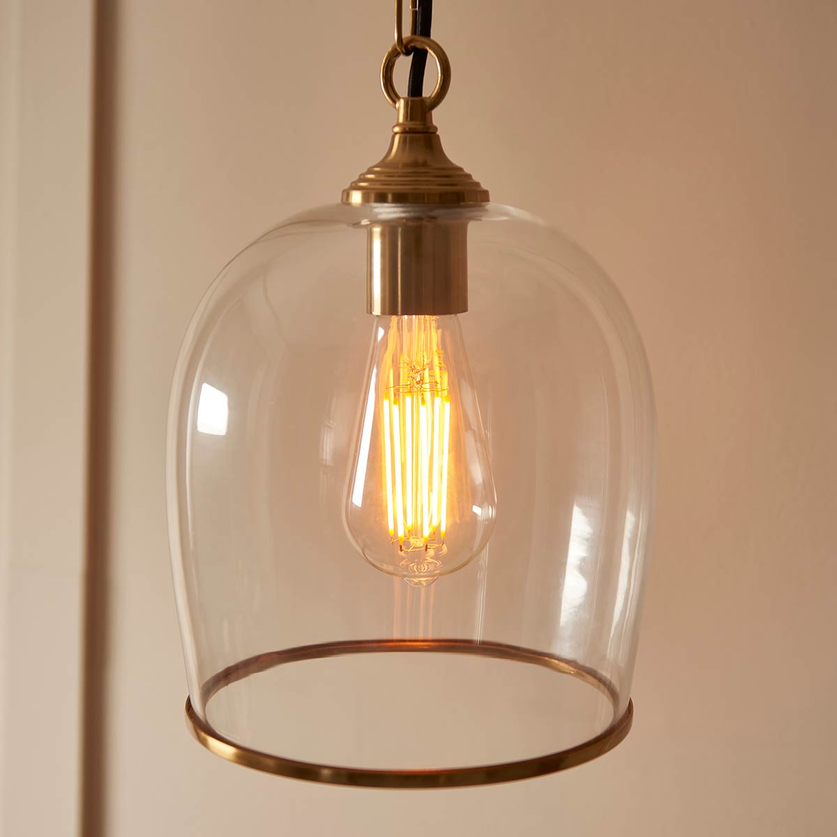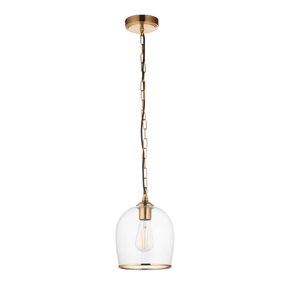The Ashcroft single light pendant in brushed aged brass with clear glass goblet shade blends classic design with modern clarity. Featuring a circular ceiling mount, height adjustable chain suspension, black braided flex and a 20cm diameter clear glass goblet shade with decorative aged brass rim.