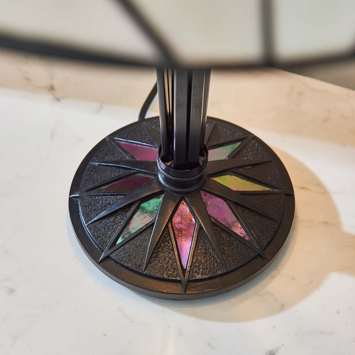 The Astoria medium 2 light Tiffany table lamp with Art Deco design is handcrafted from quality art glass, with each piece inlaid and hand soldered using traditional leaded glass techniques. A medium-sized 40cm diameter shade features an iridescent blue, purple and charcoal geometric design, inset into a pearl white base colour.