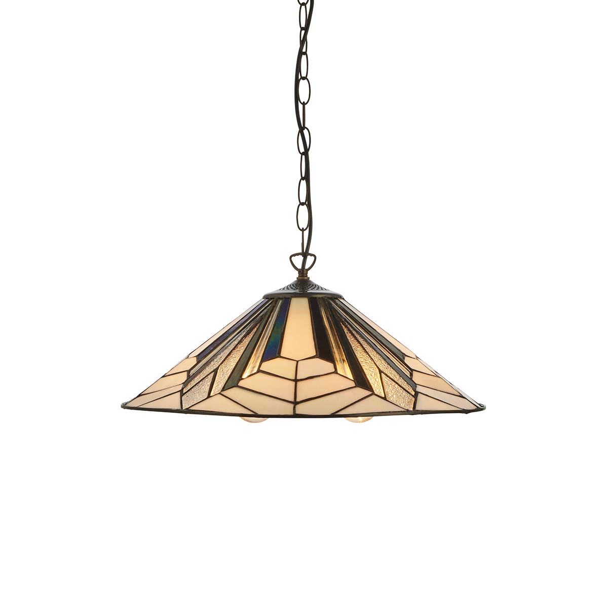 The Astoria Tiffany 3 light pendant with Art Deco style is handcrafted from quality art glass, with each piece inlaid and hand soldered using traditional leaded glass techniques. A large 48cm diameter downward shade features an iridescent blue, purple and charcoal geometric design, inset into a pearl white base colour.