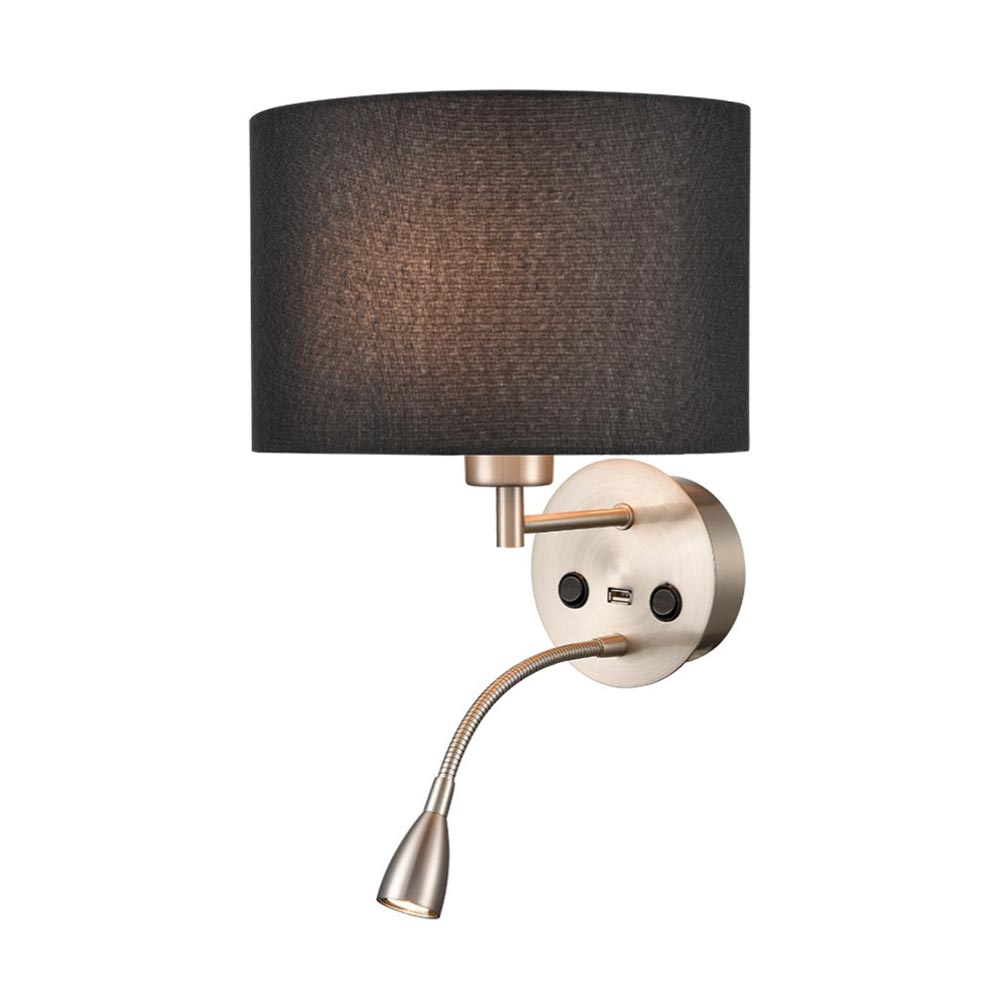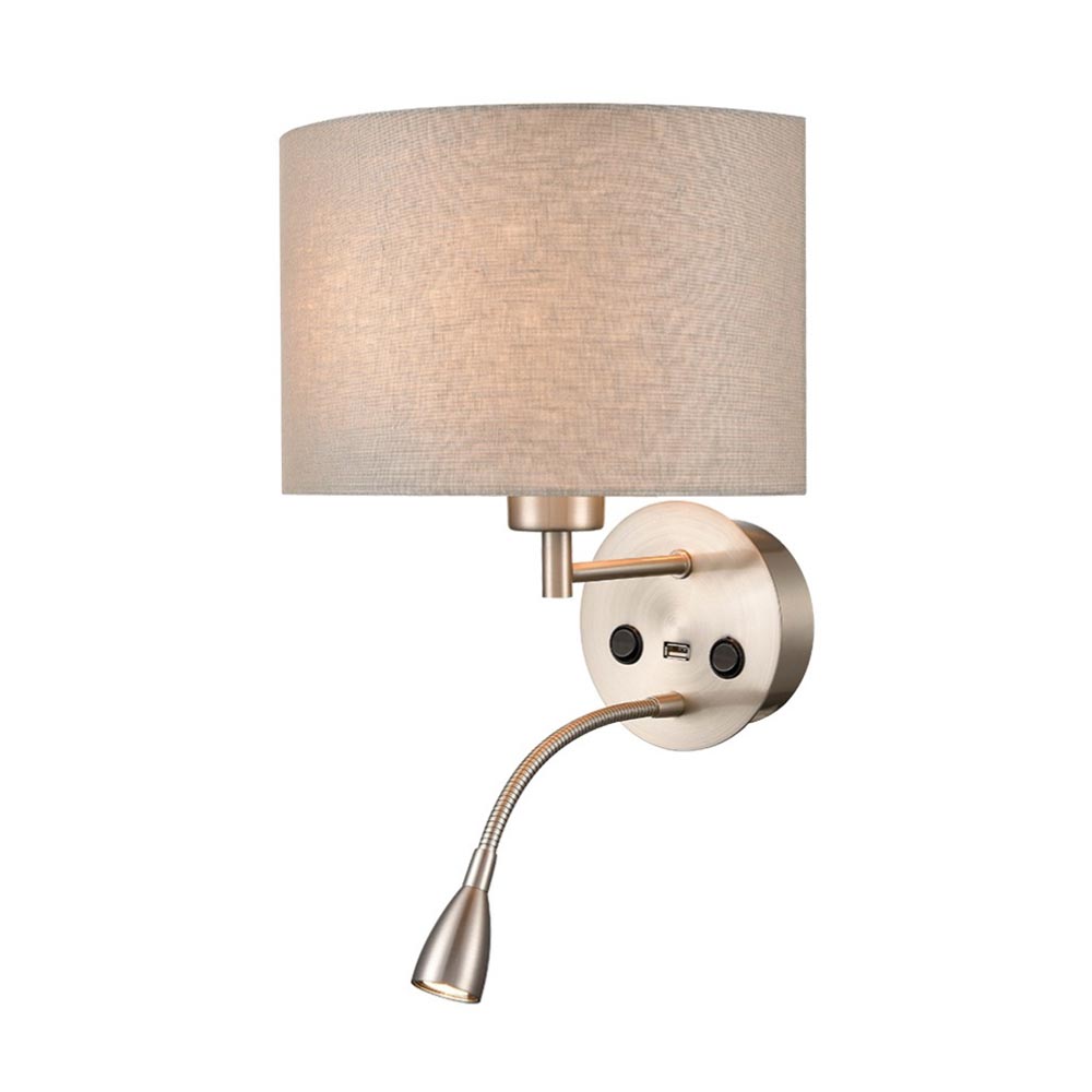 The two switches allow you to use the main light and reading light independently, and the USB allows you to charge your portable devices. The timeless satin nickel finish blends well with a variety of room styles, and the boutique style gives any room a lift. Available with a choice of shade colour and ideal for use on your bedroom, living room or dining room wall.