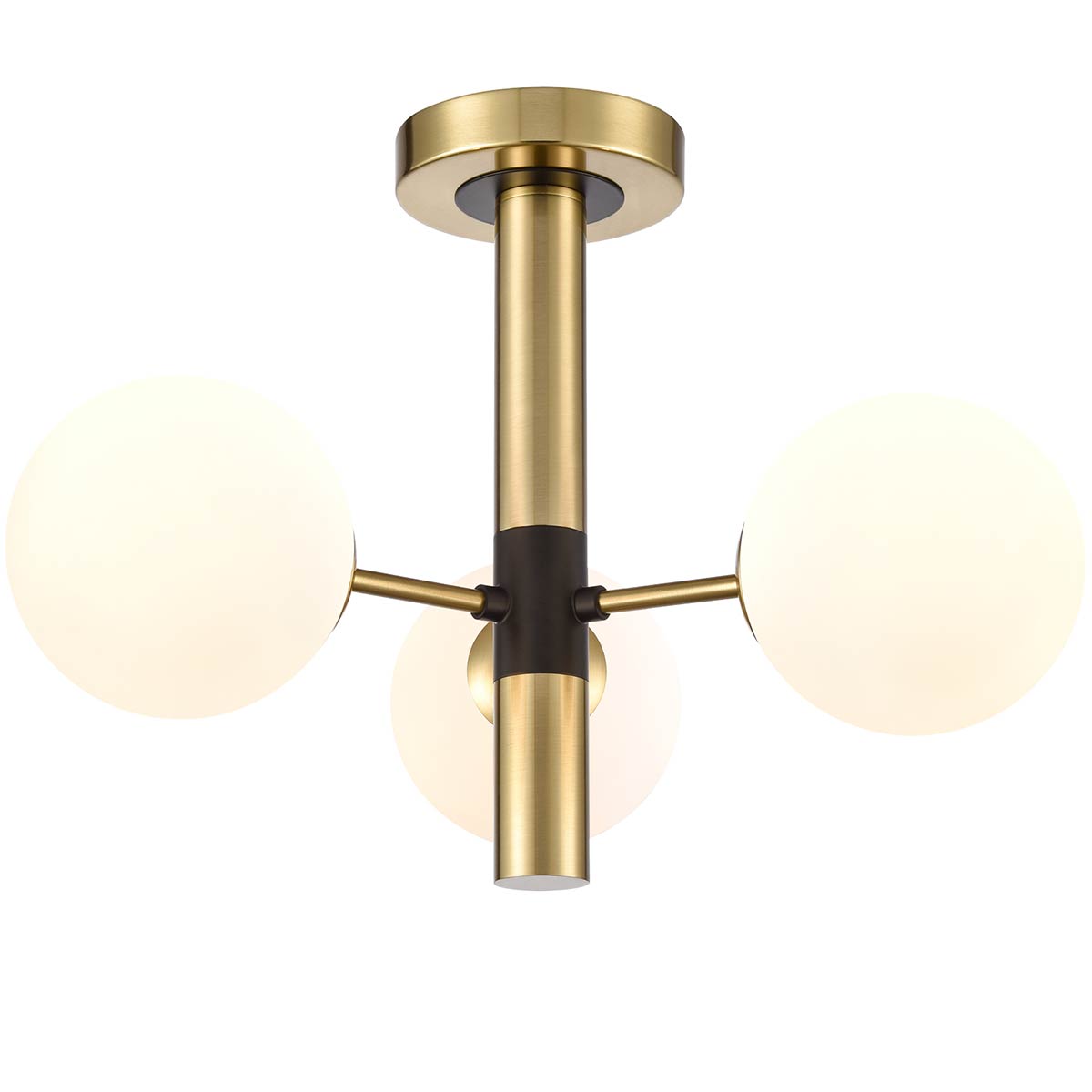 New for 2026, the Axle 3 light semi flush ceiling light in satin brass and matt black with opal white glass globe shades from Franklite. Designed for rooms with a low ceiling, the Axle features a circular ceiling mount and short drop rod, finished in satin brass. Three straight arms are fitted with matt opal white glass globe shades, and the matt black details contrast beautifully.