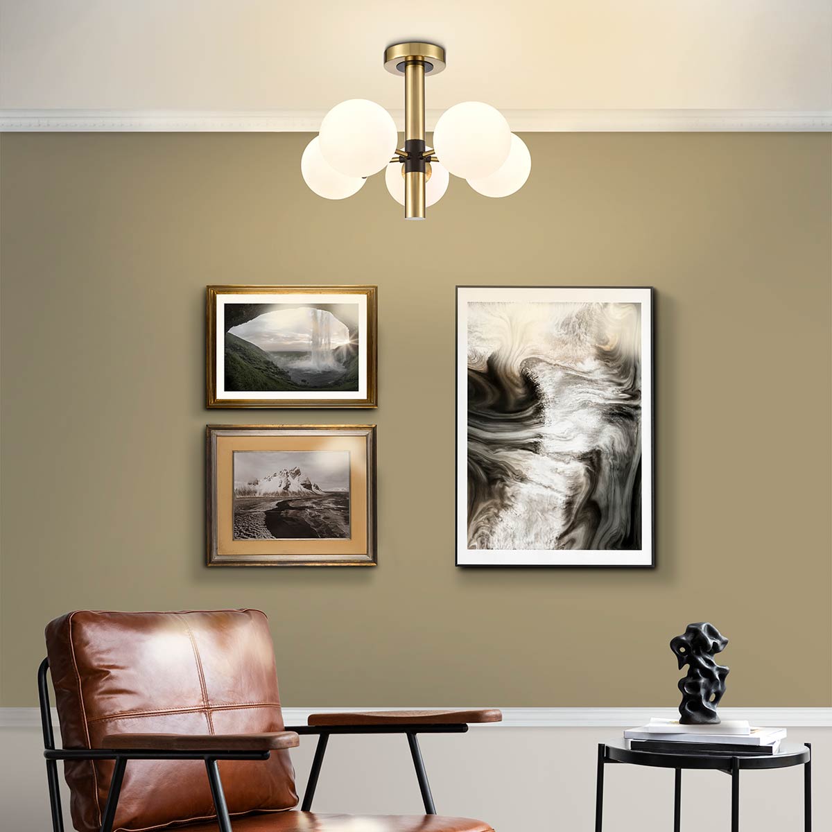 New for 2026, the Axle 5 light semi flush ceiling light in satin brass and matt black with opal white glass globe shades from Franklite. Designed for rooms with a low ceiling, the Axle features a circular ceiling mount and short drop rod, finished in satin brass. Five straight arms are fitted with matt opal white glass globe shades, and the matt black details contrast beautifully.