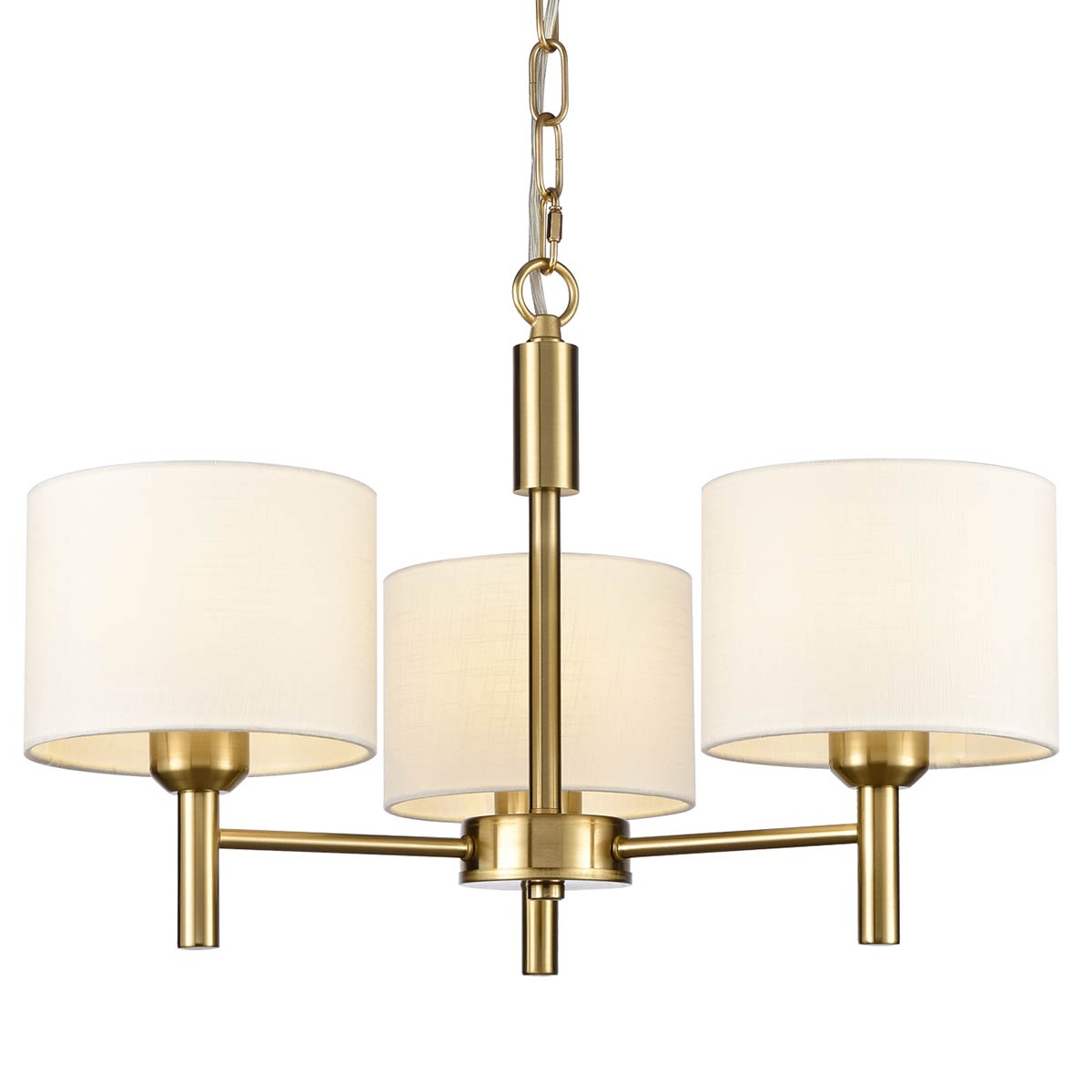 Boasting a circular ceiling mount, chain suspension and central column, with three straight aged brass finish arms and upward facing off-white textured fabric drum shades. The fabric shades provide a softer, glare free light. Ideal for a bedroom, living or dining room. Part of the Barolo collection from Franklite, trusted for quality lighting.