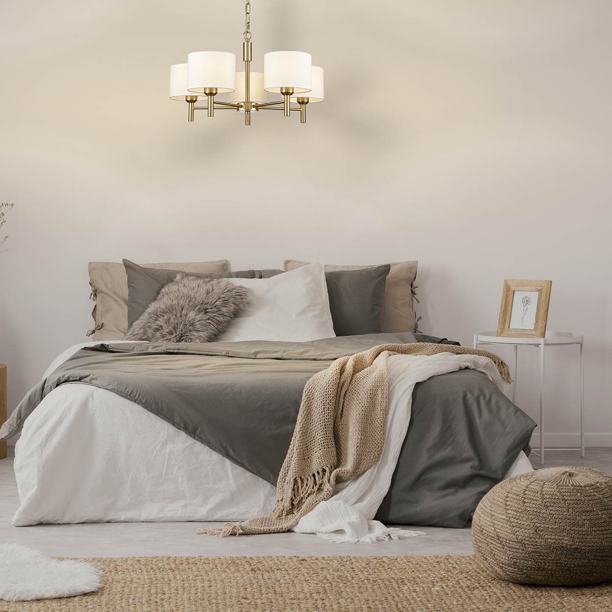 The Barolo 5 light dual mount ceiling light in aged brass finish with off-white textured fabric shades from Franklite features classic looks and quality construction. A versatile ceiling light that can be used as a hanging chandelier, or as a semi-flush for low ceilings. At home in both traditional and modern settings, the classic lines and aged brass finish are timeless.