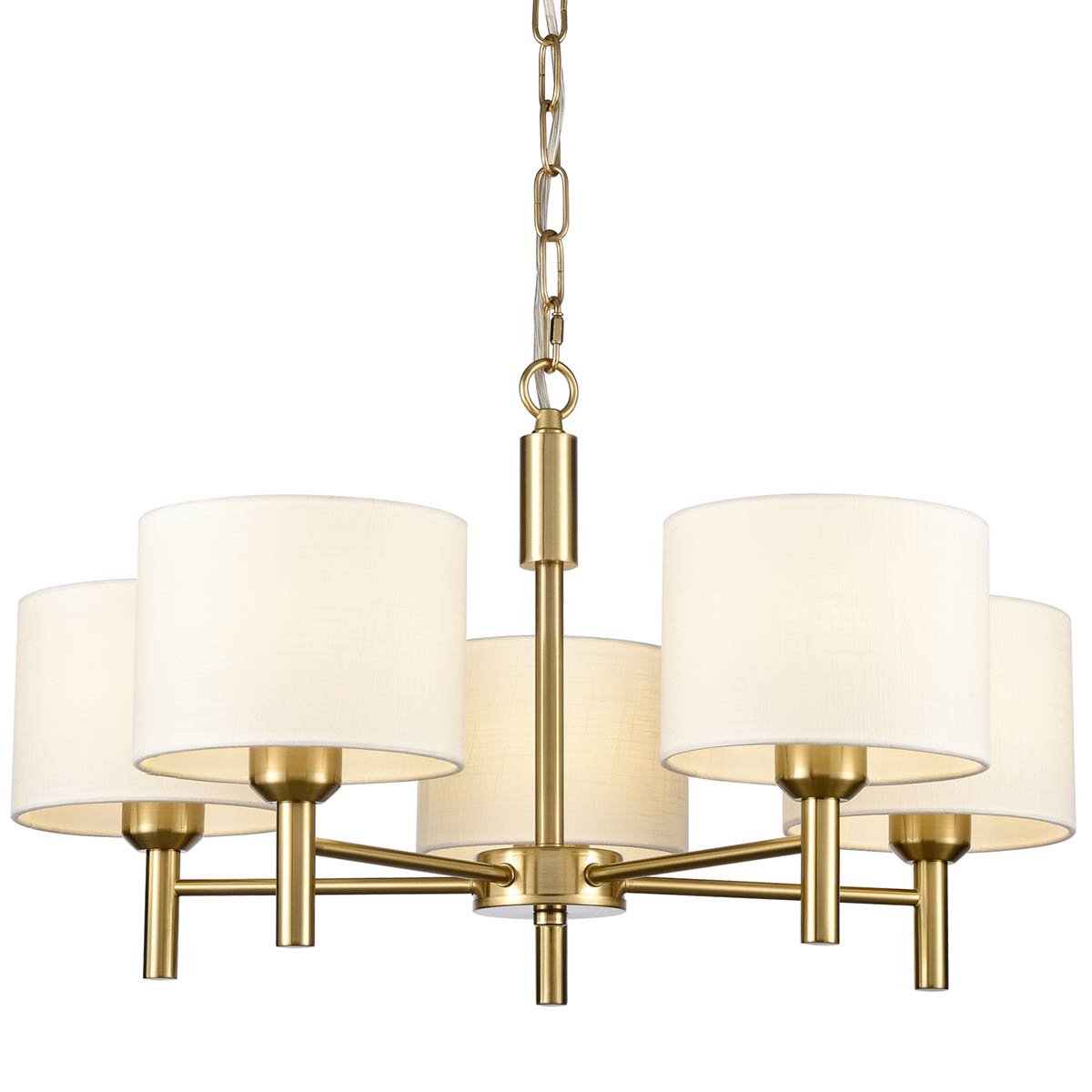 Boasting a circular ceiling mount, chain suspension and central column, with five straight aged brass finish arms and upward facing off-white textured fabric drum shades. The fabric shades provide a softer light, making it ideal for any room and perfect for a bedroom, hallway, living or dining room. Part of the Barolo collection from Franklite, trusted for quality lighting.