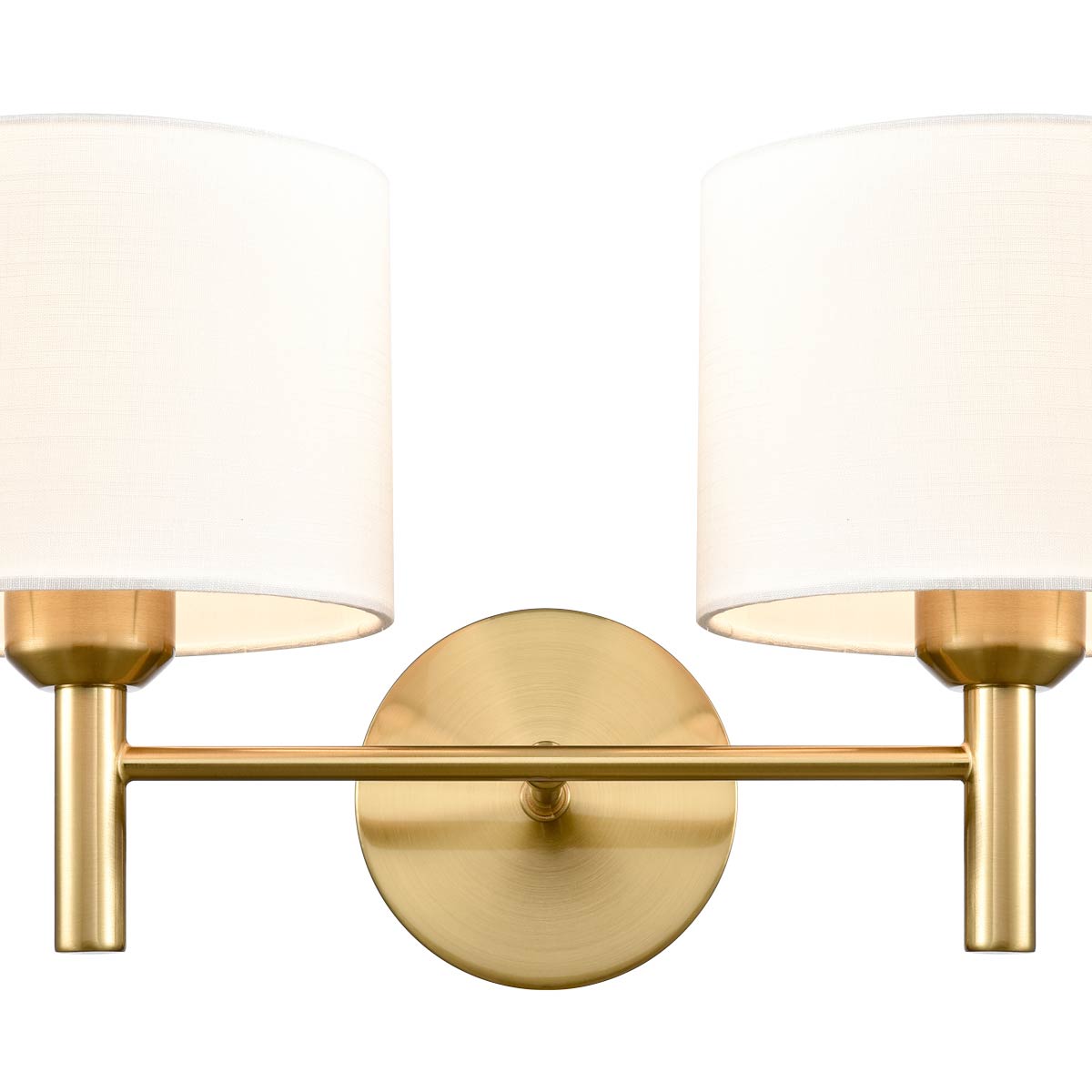 The Barolo twin aged brass wall light with off-white textured fabric shades from Franklite features classic looks and quality construction. A simple wall light, with circular wall mount, horizontal bar and an upright lamp holder at each end. At home in both traditional and modern settings, the classic lines and aged brass finish are timeless.