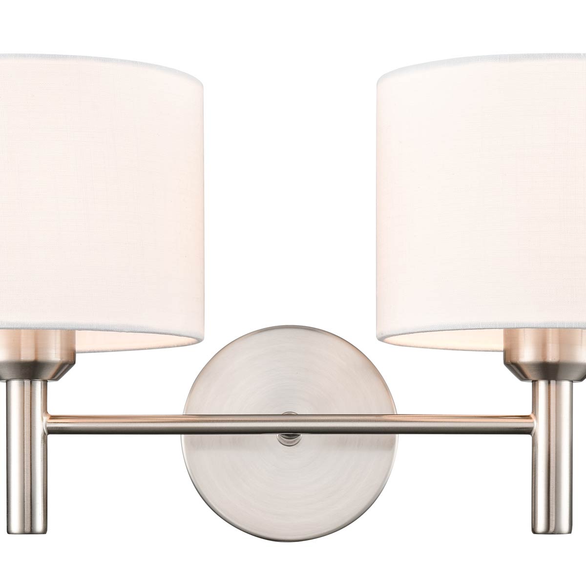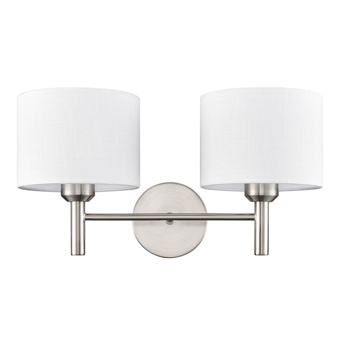 New for 2026, the Barolo twin satin nickel wall light with off-white textured fabric shades from Franklite features classic looks and quality construction. A simple wall light, with circular wall mount, horizontal bar and an upright lamp holder at each end. At home in both traditional and modern settings, the classic lines and satin nickel finish are timeless.