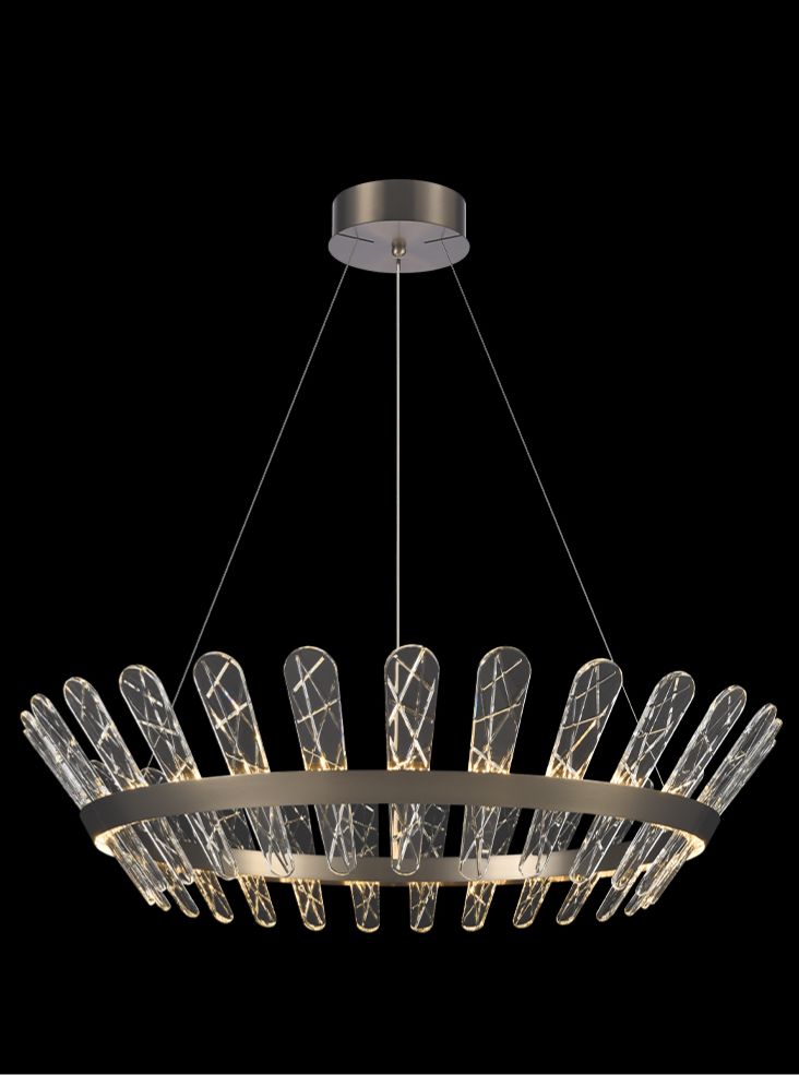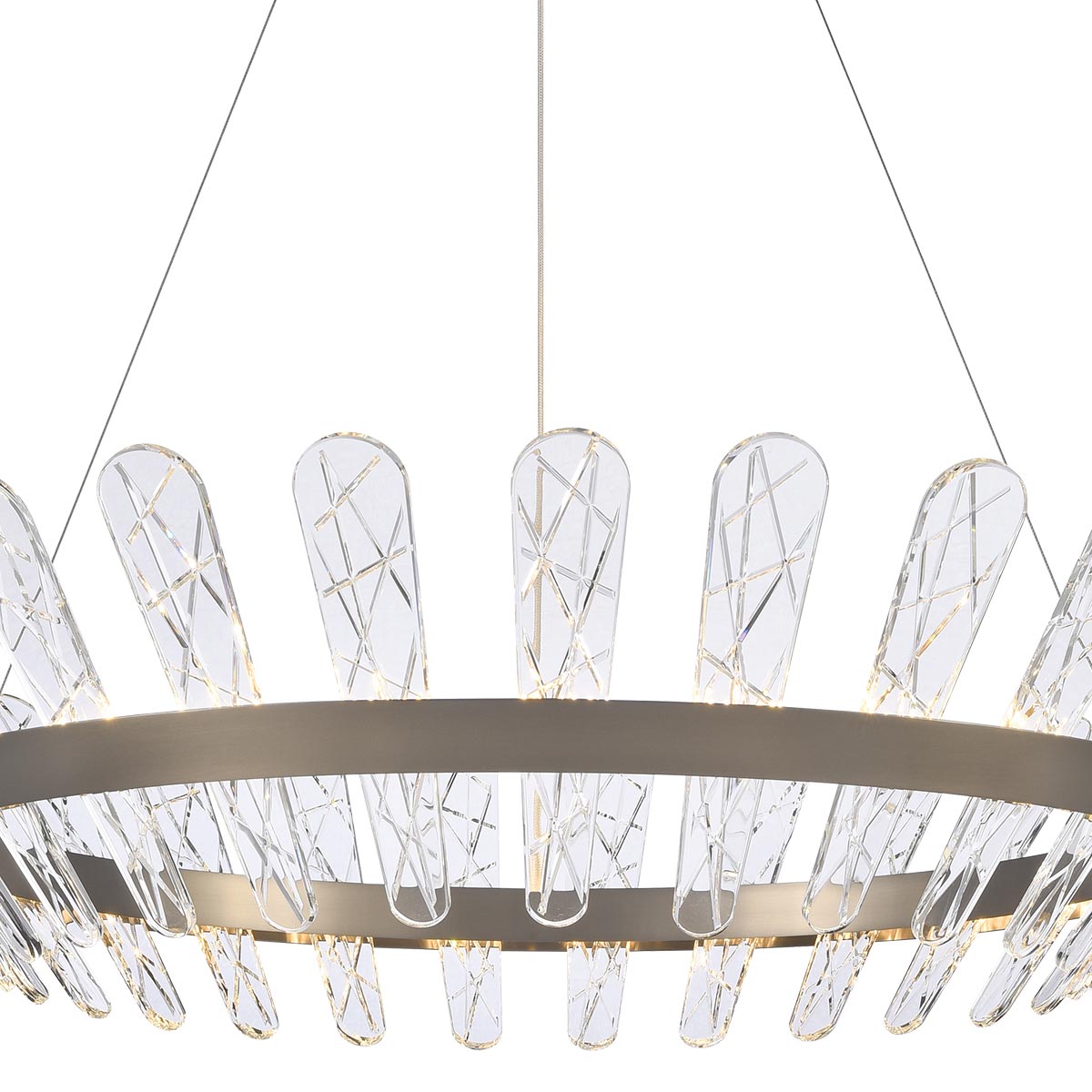 Modern and stunning, the Beatrice large dimmable LED pendant in bronze with crystal glass from Franklite can transform any room. This 950mm diameter LED pendant features a brushed brass finish LED filled ring, decorated with delicate veined crystal glass panels. Suspended from a circular ceiling mount and multiple fine wire suspension.