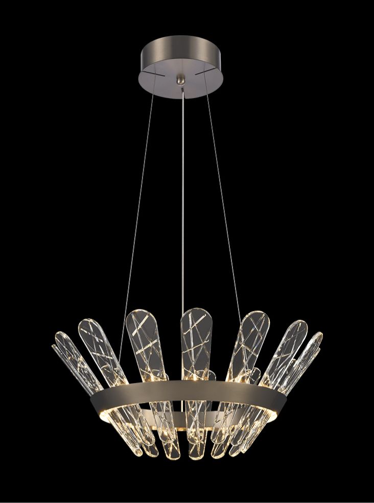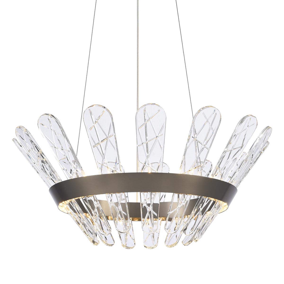 Modern and stunning, the Beatrice small dimmable LED pendant in bronze with crystal glass from Franklite can transform any room. This 550mm diameter LED pendant features a brushed brass finish LED filled ring, decorated with delicate veined crystal glass panels. Suspended from a circular ceiling mount and multiple fine wire suspension.