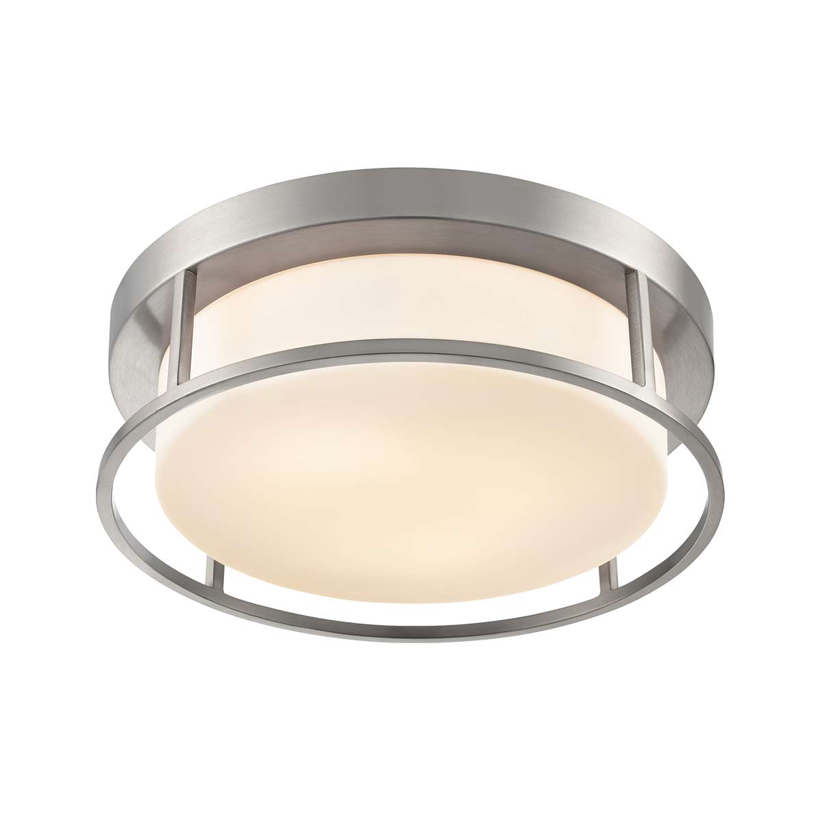 Enhance a bedroom, hallway, living or dining room with the Blaine 2 light flush ceiling light in satin nickel with opal glass shade by Franklite. A quality choice, featuring a 30cm diameter ceiling mount and outer frame in satin nickel, with a central opal white glass shade housing two bulbs. Light from the bulbs passes through the etched glass, creating wonderful glare free illumination.