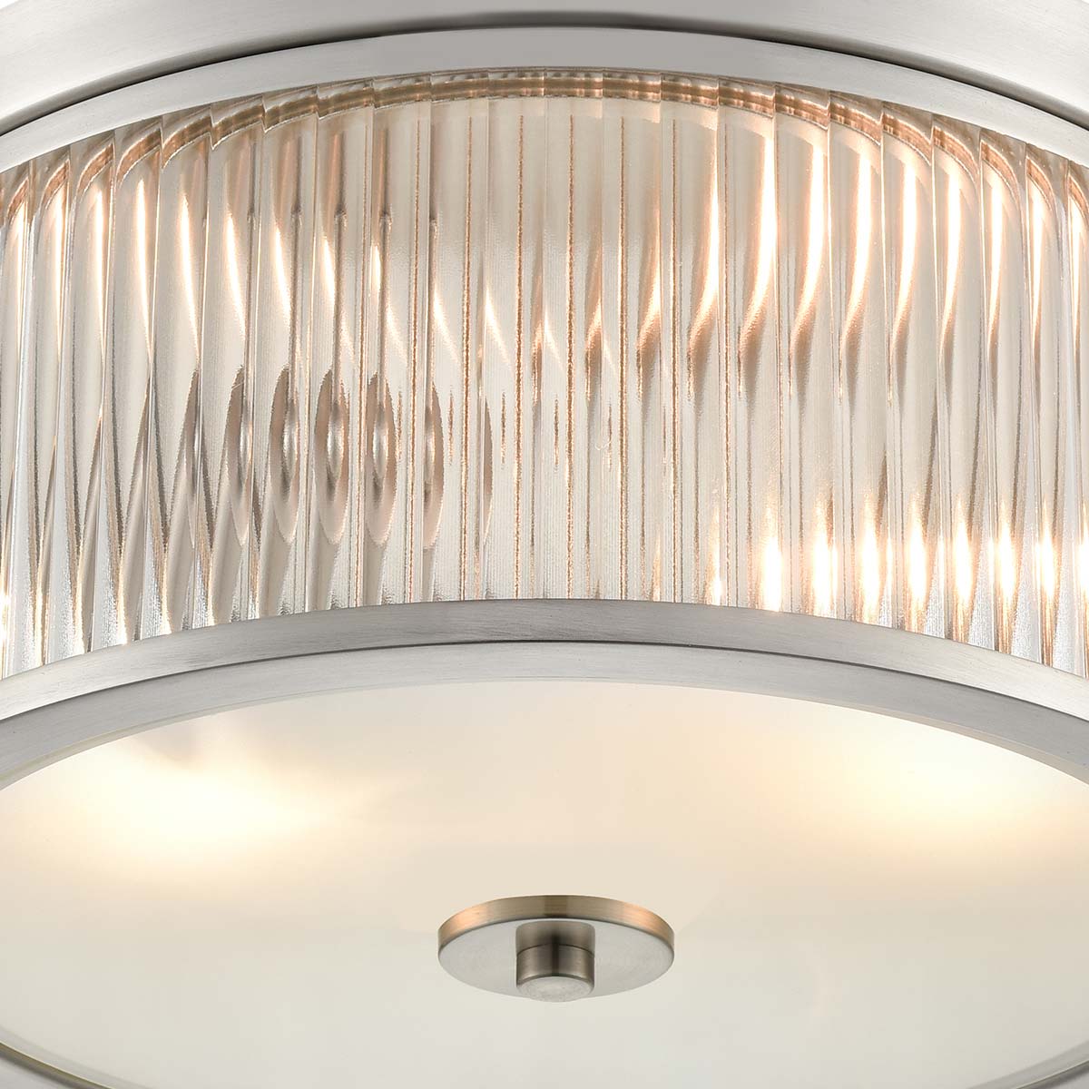 Introducing the Bonham, a 2 light traditional flush ceiling light, with satin nickel finish metalwork, ribbed glass sides and a frosted lower diffuser. Designed for rooms with a low ceiling, the Bonham is a quality choice, featuring clear ribbed glass sandwiched between circular top and bottom frames and a lower frosted glass diffuser to prevent glare.