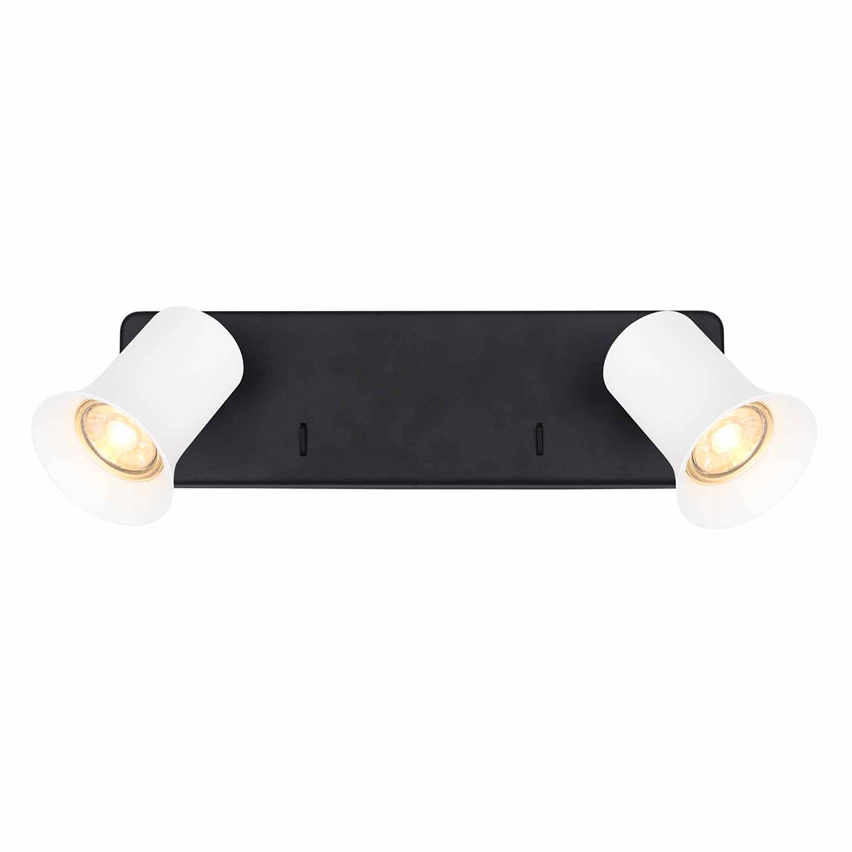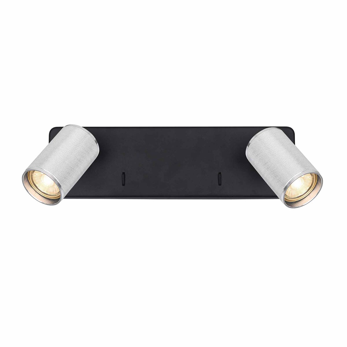 The Broadway twin matt black wall spotlight with choice of decorative sleeves from Franklite is modern, stylish and practical. Perfect for living rooms, bedrooms and kitchen walls, it features a long rectangular wall plate, with a two fully adjustable spotlight heads. Each spotlight is switched independently and is tilt and swivel adjustable.