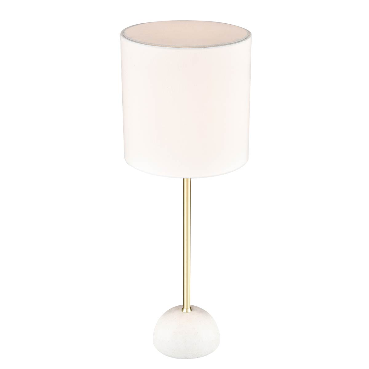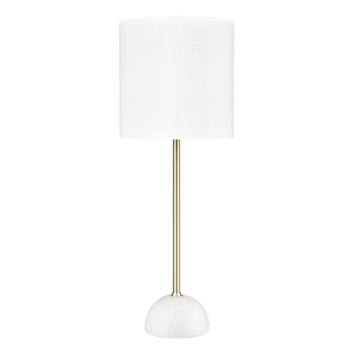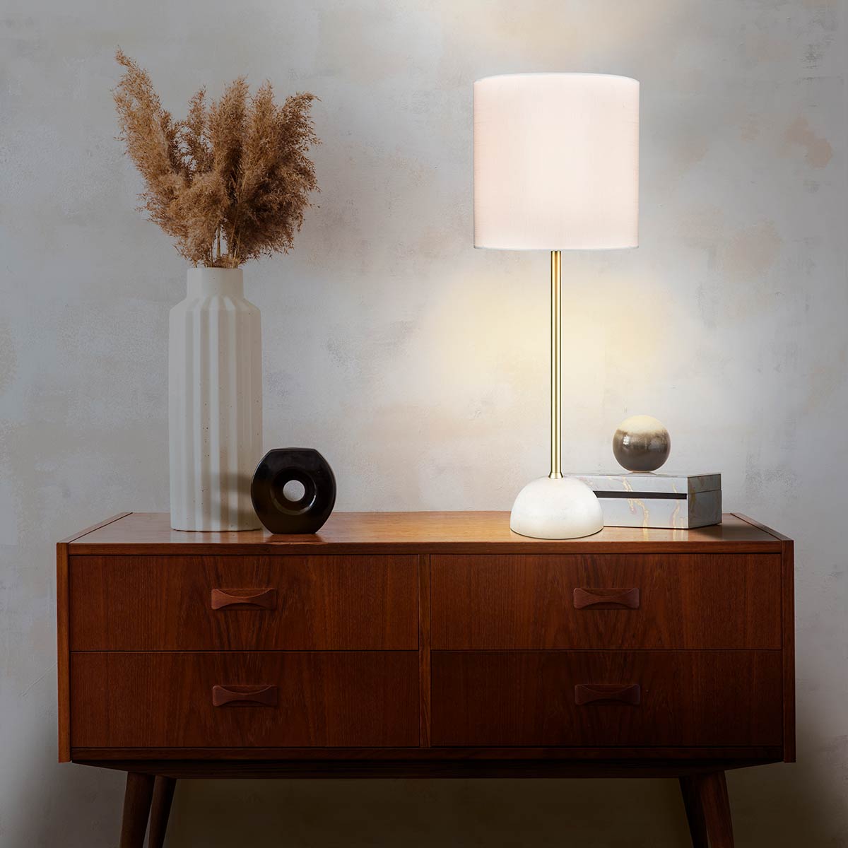 The Brooke dimmable satin brass table lamp with off-white textured fabric shade and white marble base by Franklite creates a boutique hotel look. Featuring a domed white marble base, short stem and 25cm diameter off-white fabric cylinder shade fitted with a top mounted diffuser to soften the light beautifully. Fitted with a convenient inline dimmer switch.