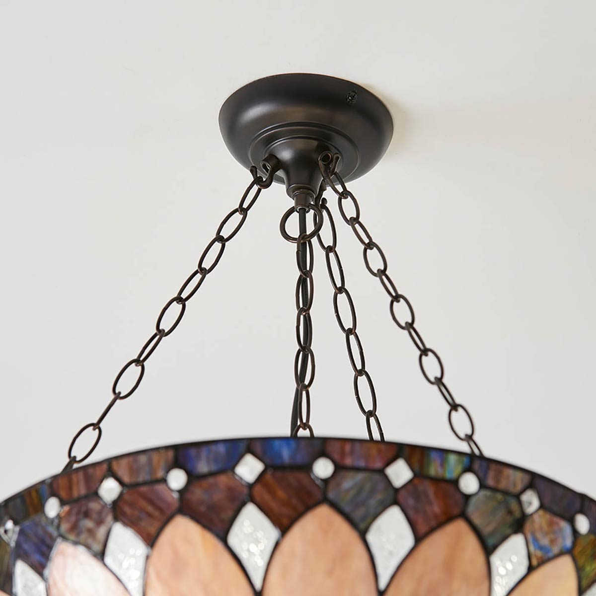 The Brooklyn large Tiffany 3 chain pendant light in Art Deco style is handcrafted, and the colours may vary slightly from the images shown, as each piece of glass is hand-made and may differ slightly in colour or shade. This should not be seen as a fault, rather something that makes each Tiffany shade unique.