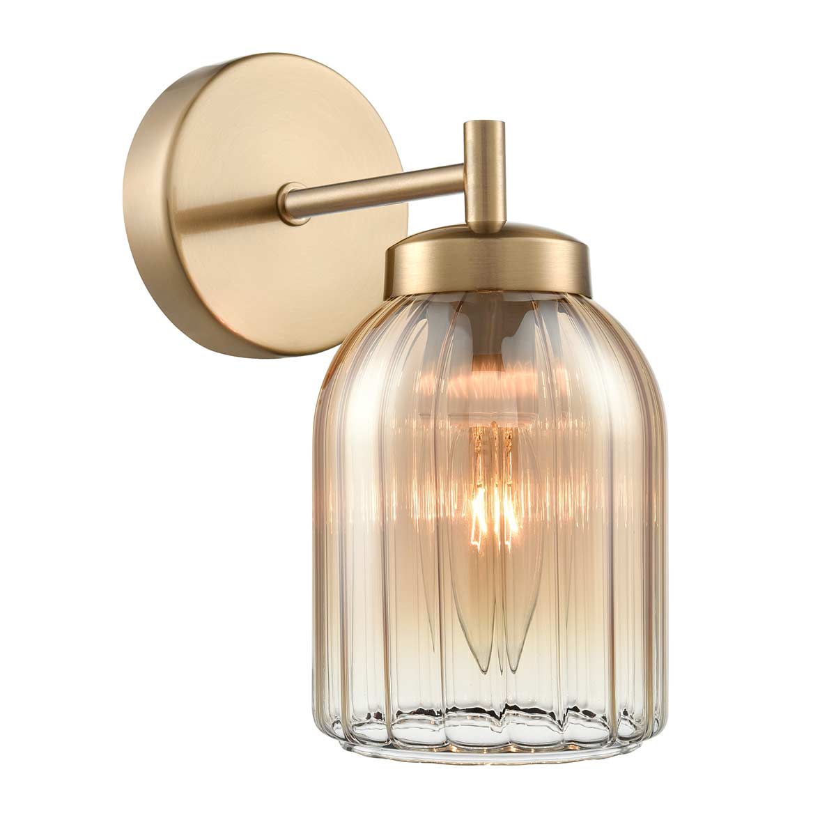 New for 2026, the Caligo single aged brass wall light with amber ribbed glass shade from Franklite features classic looks and quality construction. A simple, compact wall light, with a circular wall mount, short straight arm and downward facing ribbed amber glass shade.