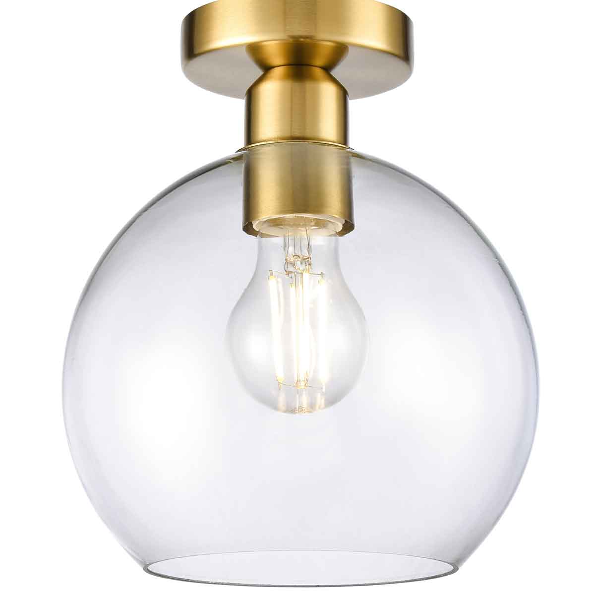 The small Chalice 1 light traditional flush ceiling light in aged brass, with clear glass shade from Franklite. Designed for rooms with a low ceiling, it features a circular flush ceiling mount, lamp holder and 18cm diameter clear glass open globe shade. A single bulb shines through the clear glass, producing bright, all round illumination.