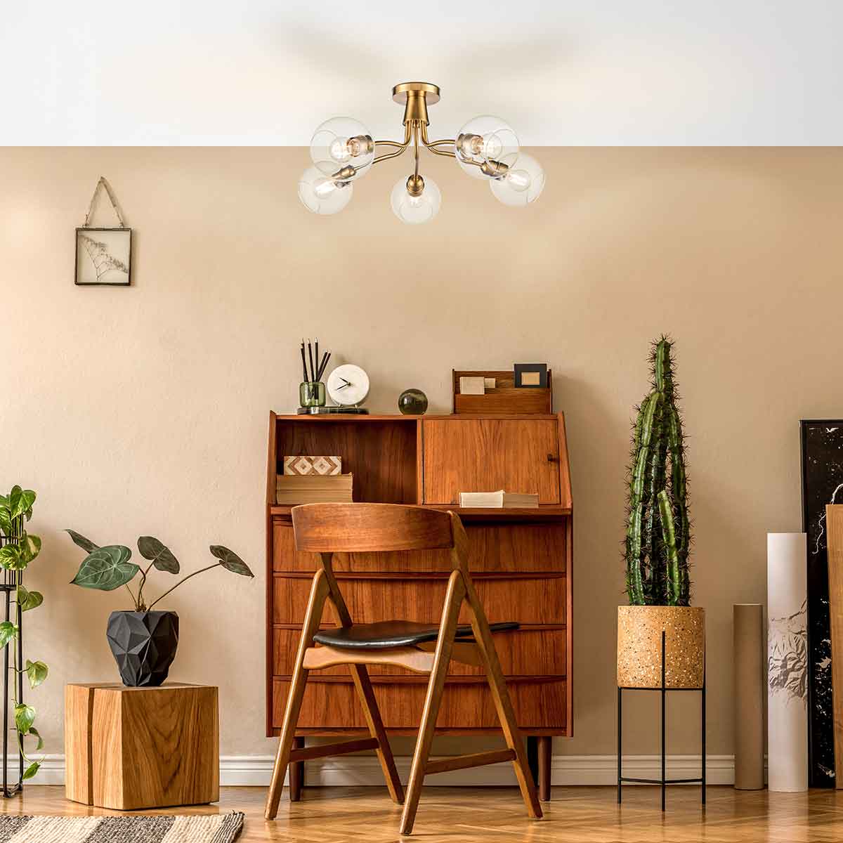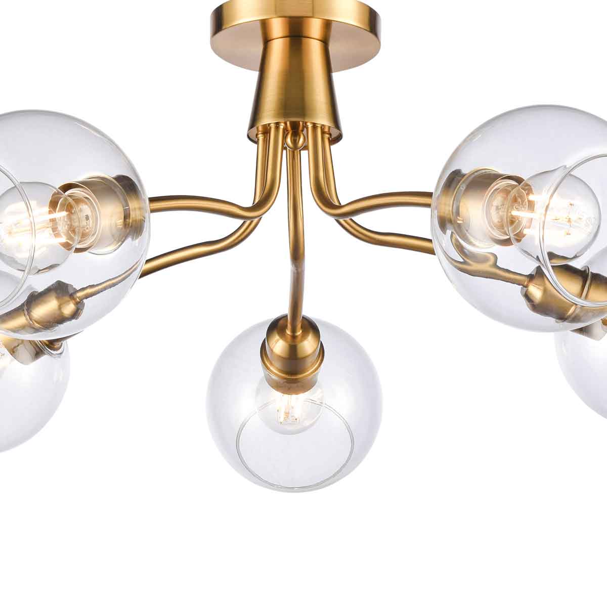 Suitable for both traditional and modern homes, the slightly curved arms soften the silhouette, and the aged brass finish creates warmth. The five bulbs give masses of light, making it ideal for any larger room with a low ceiling and perfect for a bedroom, hallway, living or dining room.
