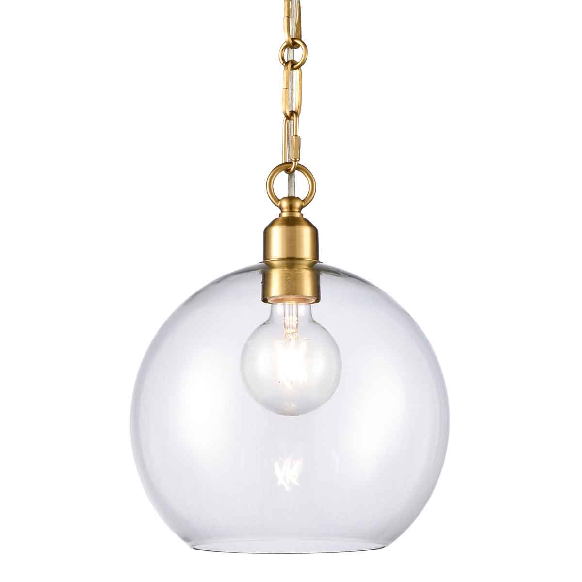 Introducing the Chalice traditional pendant ceiling light in aged brass with clear glass shade by Franklite. The Chalice features a circular ceiling mount, decorative chain suspension and three slightly curved arms and a 25cm diameter clear glass open globe shade. A single bulb shines through the clear glass, producing bright, all round illumination.