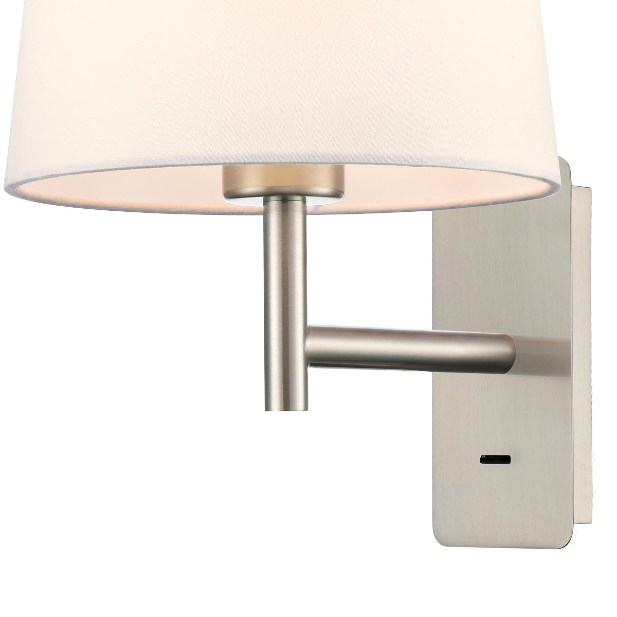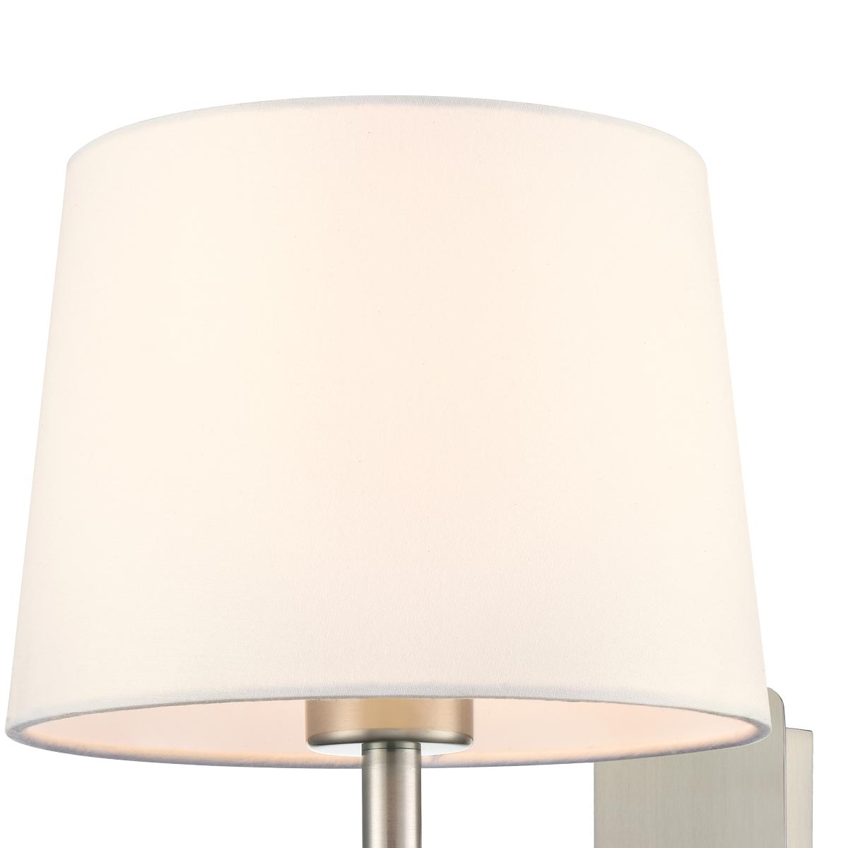 The timeless satin nickel finish blends well with a variety of room styles, and the off-white shade complements almost any style of decor. Ideal for use on your bedroom, living room or dining room wall.