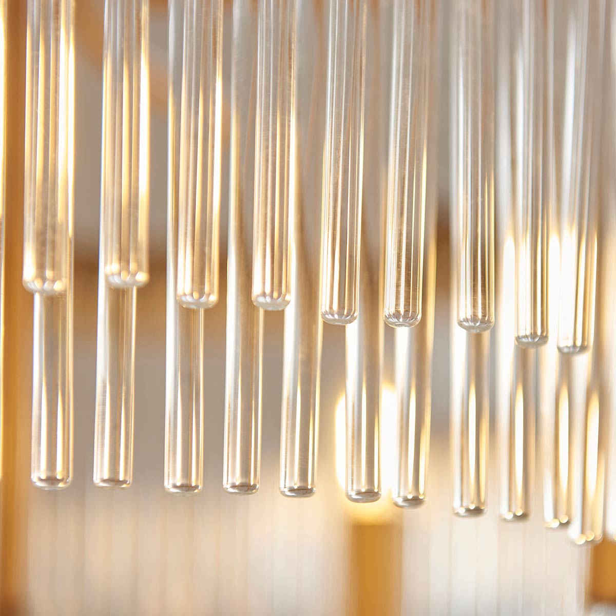 A timeless classic, combining subtle sophistication with a flawless high quality finish. The antique brass metalwork brings warmth into the room and the clear glass rods create a wonderful display. Perfect for traditional and contemporary homes alike and ideal for living rooms, hallways, stairwells, or over dining tables to create a stunning focal point.