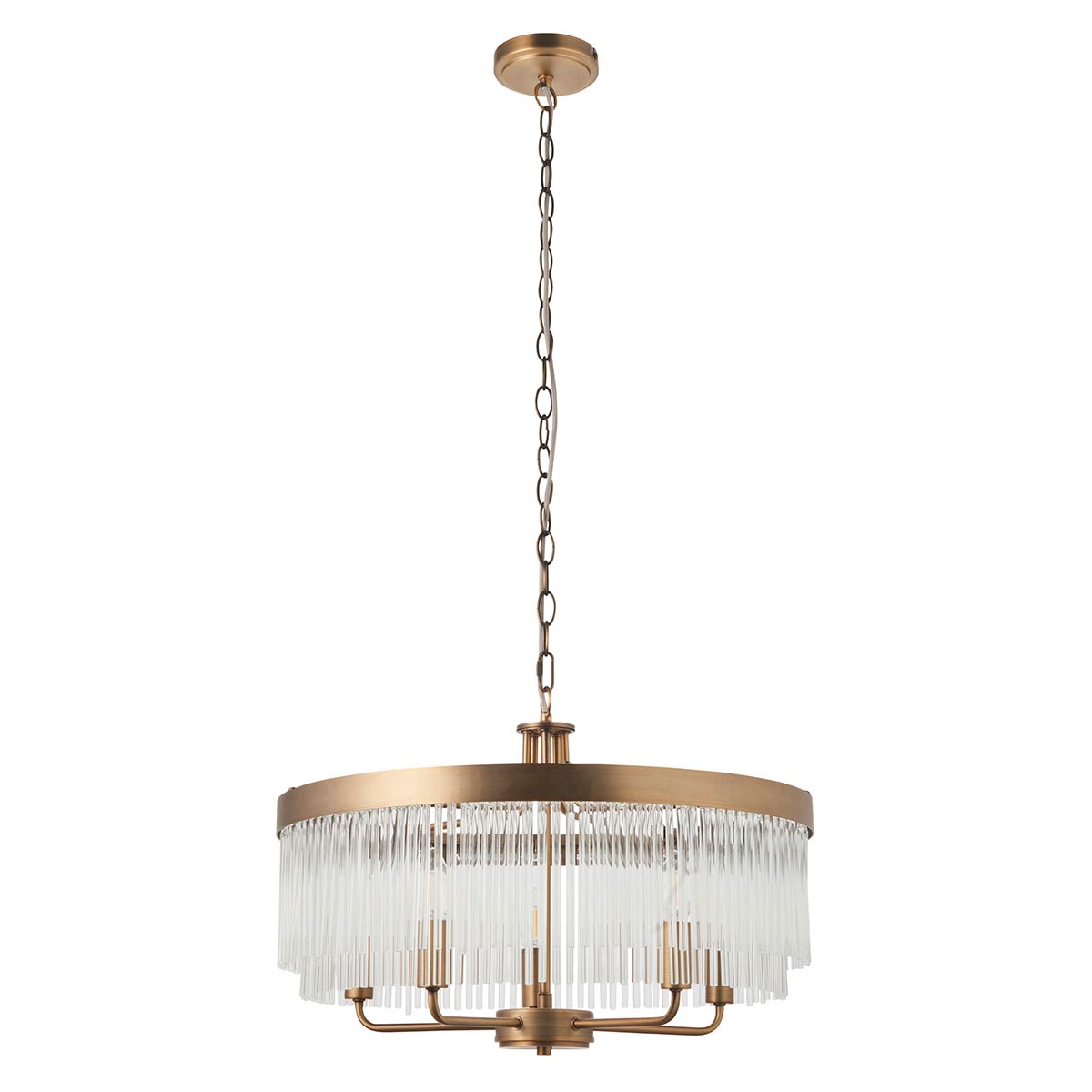 Add a touch of luxury to your home with the Clermont 5 light pendant chandelier in antique brass with clear glass rods by Endon Lighting.