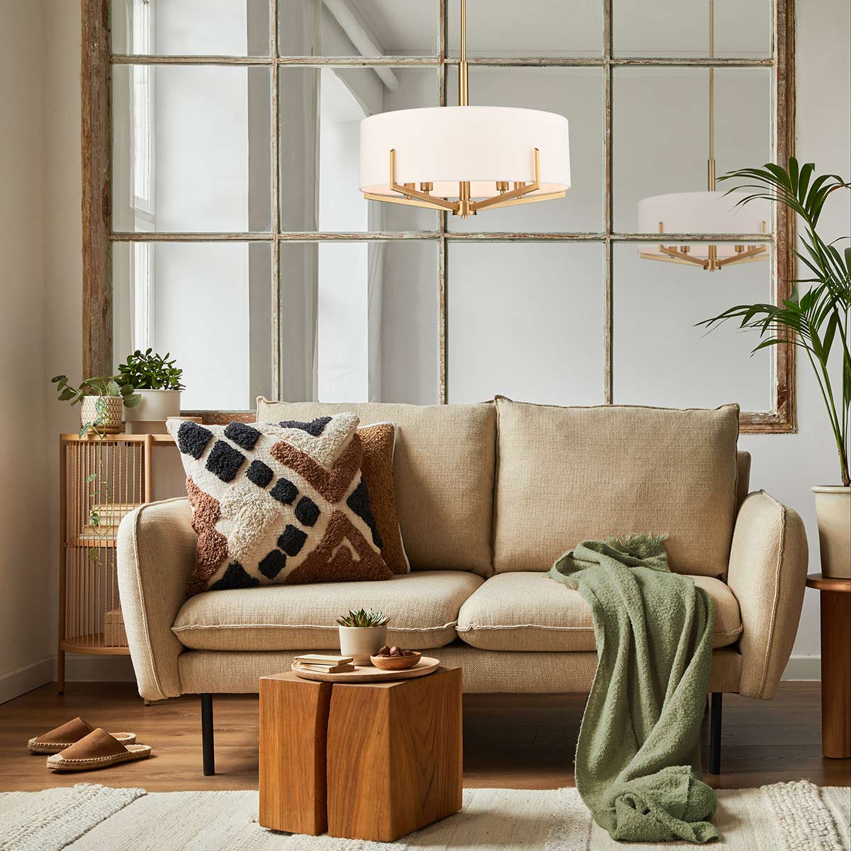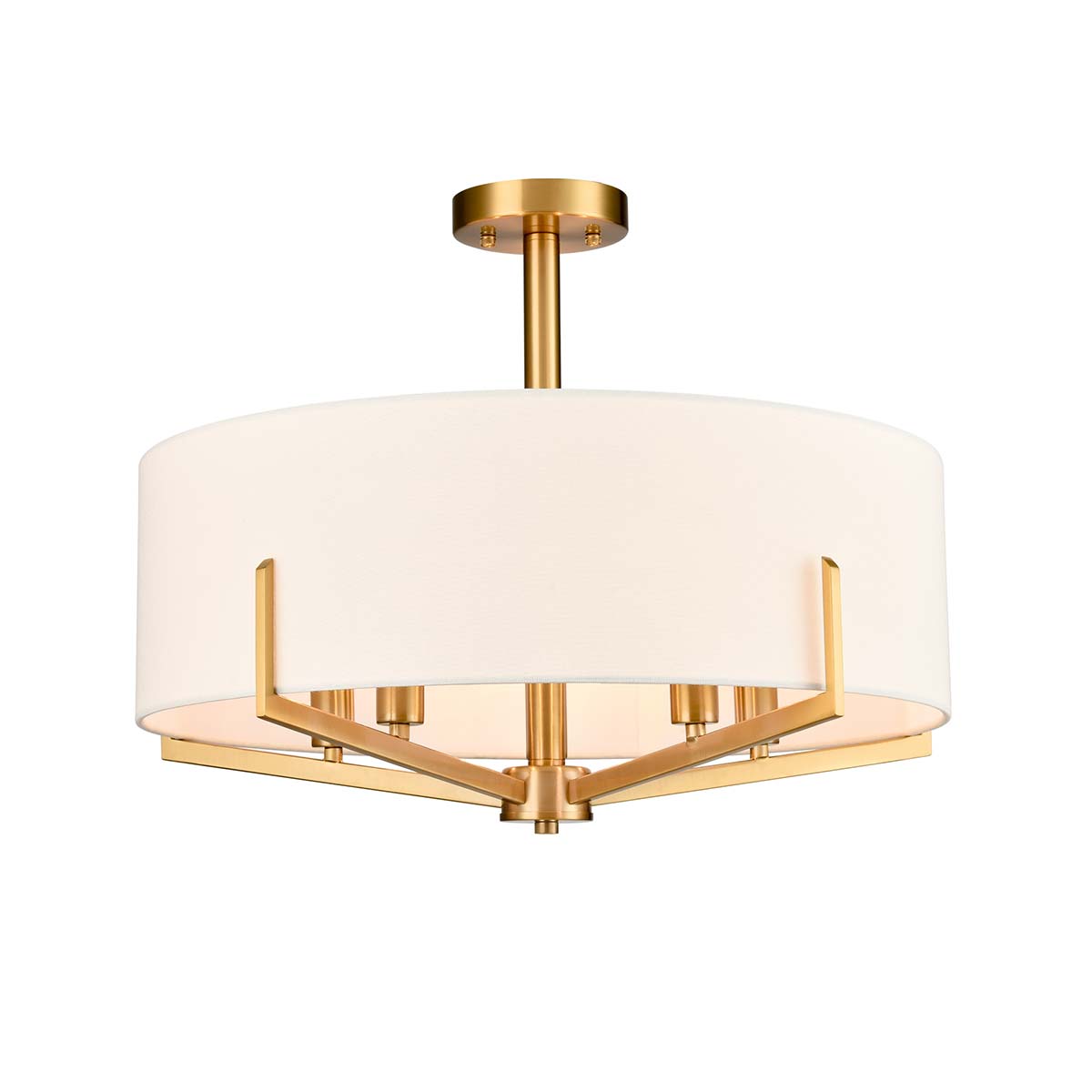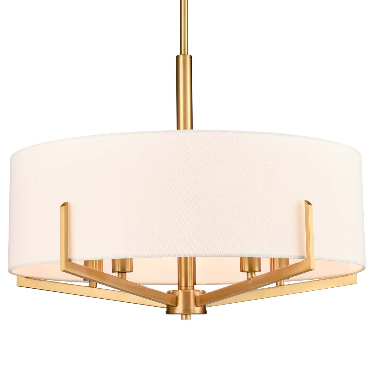 The Clifton 5 light dual mount pendant in aged brass with textured cream fabric shade and contemporary style. This pendant can be hung low as a chandelier or fitted semi flush in rooms with limited ceiling height. Featuring a circular ceiling mount, sectional drop rod and five angular arms, enhanced by a sumptuous cream drum shade that softens the light beautifully.