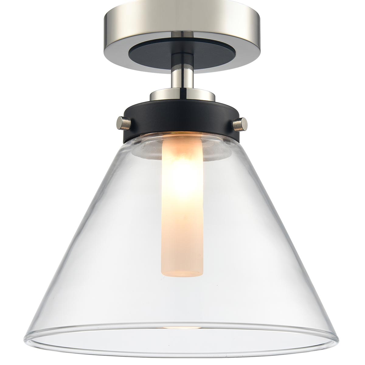 The Conica flush IP44 bathroom light in matt black and polished nickel with clear glass shade from Franklite features industrial style. Suitable for bathrooms and any other room in your home, it boasts a circular ceiling mount in bright nickel, with matt black detail, short drop rod and clear conical glass shade. A frosted diffuser surrounds the single capsule bulb for a glare free glow.