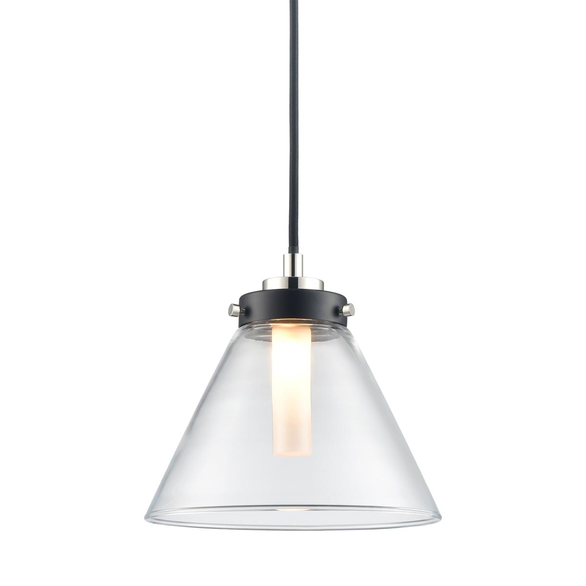 The Conica IP44 bathroom pendant in matt black and polished nickel with clear glass shade from Franklite features industrial style. Suitable for bathrooms and any other room in your home, it boasts a circular bright nickel ceiling mount, with matt black detail, black cable suspension and clear conical glass shade. A frosted diffuser surrounds the single capsule bulb for a glare free glow.