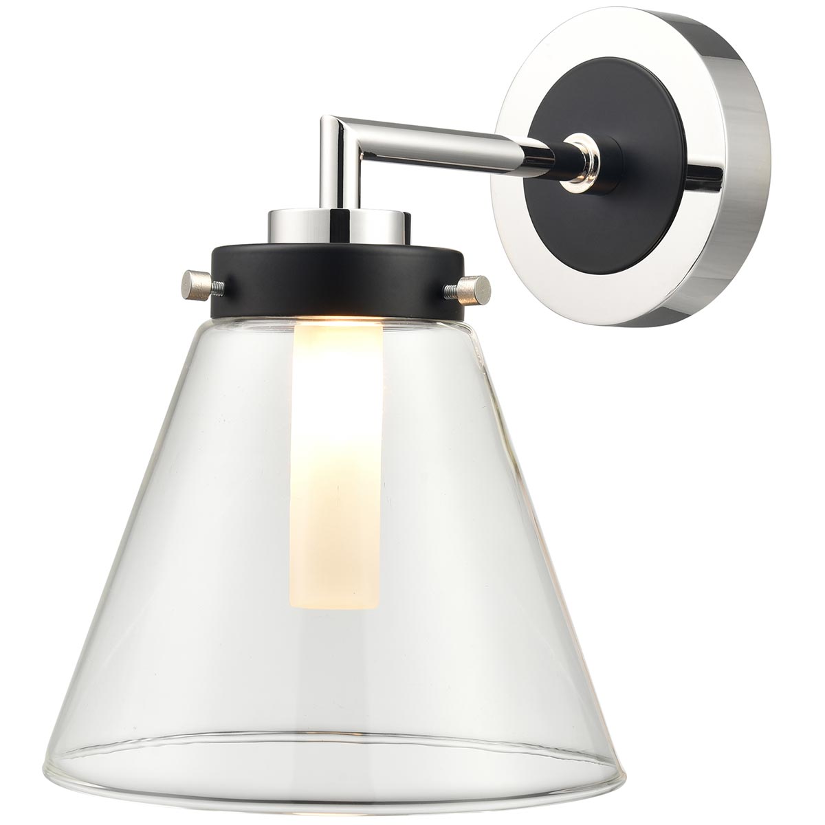 The Conica IP44 bathroom wall light in matt black and polished nickel with clear glass shade from Franklite features industrial style. Suitable for bathrooms and any other room in your home, it boasts a circular bright nickel wall mount, with matt black detail and clear conical glass shade. A frosted diffuser surrounds the single capsule bulb for a glare free glow.
