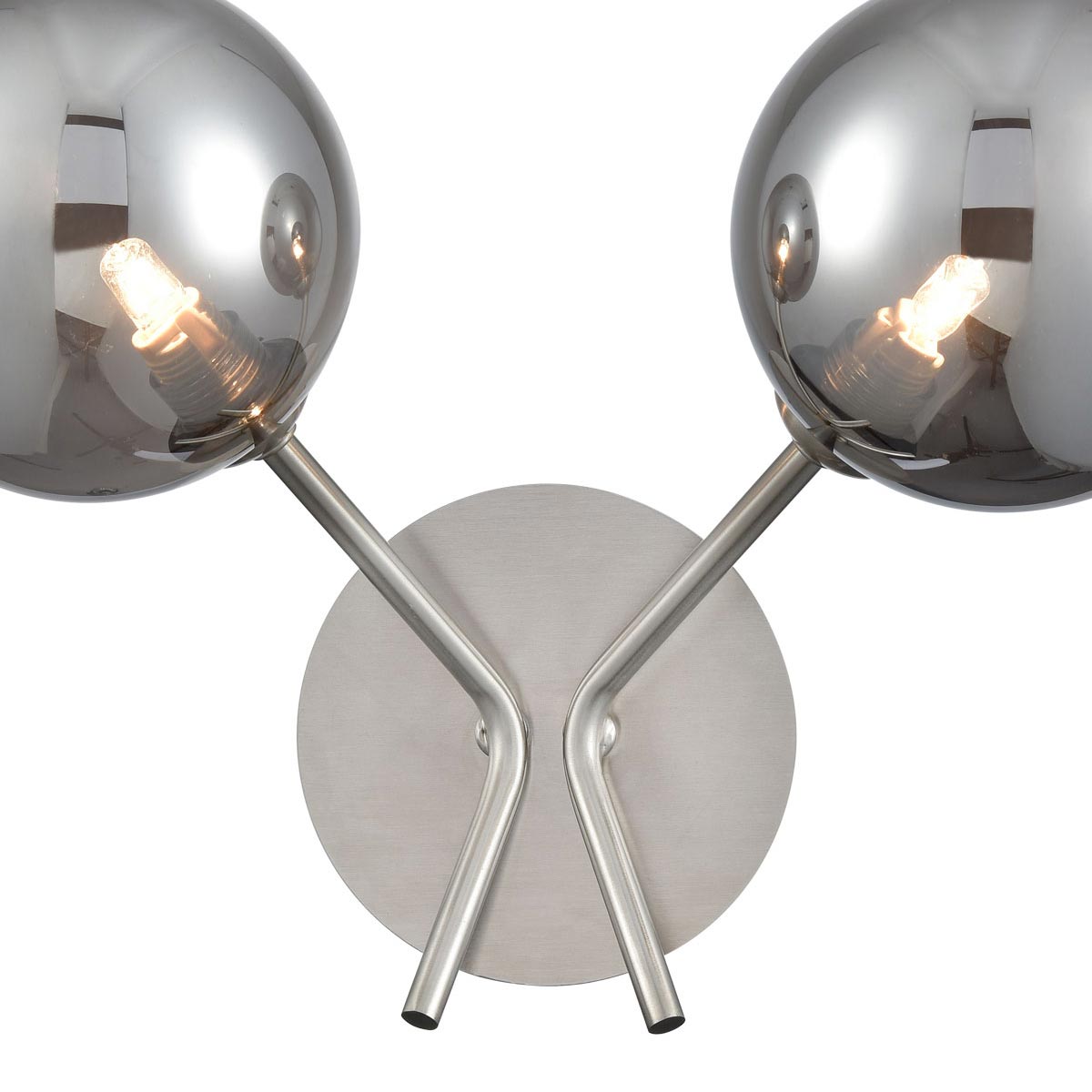 The Cosmic modern twin wall light in satin nickel finish with smoked glass shades from Franklite is attractive and practical. Part of the Cosmic collection, it features a circular wall mount and two angular arms with smoked glass globe shades. Light passes through the smoked glass, creating a relaxing, glare free atmosphere.