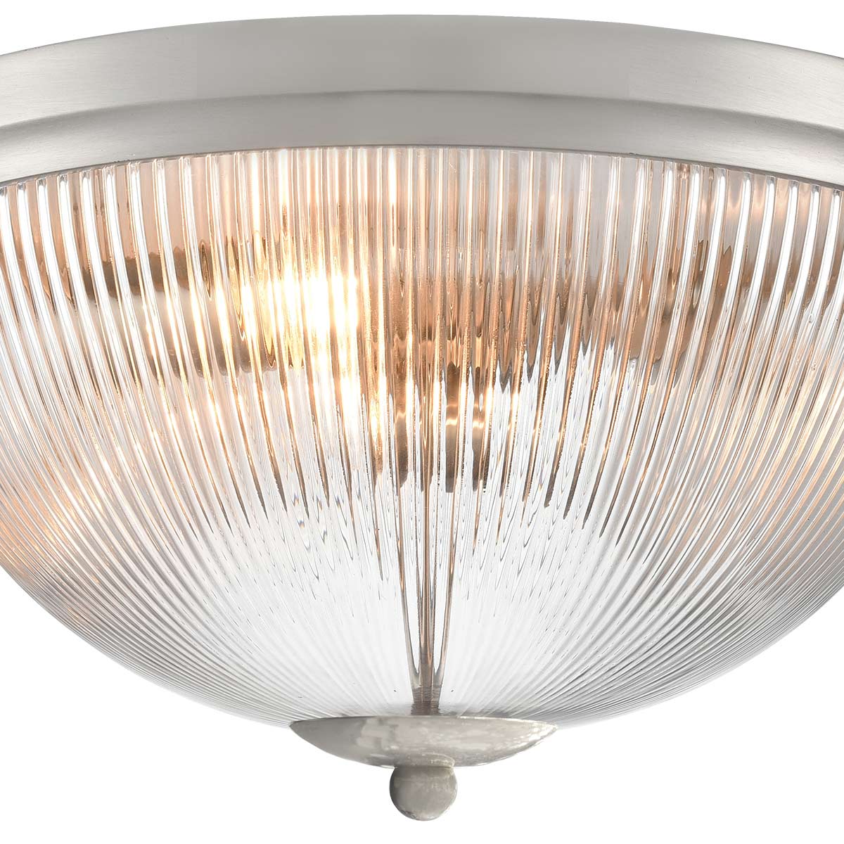 The Franklite Cupola 3 light satin nickel flush ceiling light with ribbed glass shade is traditional. Designed for rooms with a low ceiling, this flush fitting features a large 38cm diameter satin nickel finish ceiling mount, deep clear ribbed glass bowl shade and lower retaining finial. Bright light from the three bulbs passes through the ribbed glass, creating a beautiful twinkle in the room.