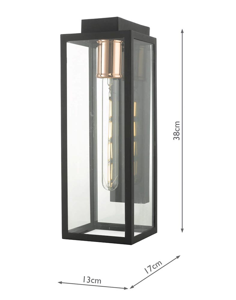 This Dar Naxos 1 light outdoor wall box lantern in matte black with clear glass panels is rated IP43. A quality external wall box lantern with tall rectangular mount and clear glass panels. This lantern does not have a bottom glass panel for easy lamp changing. Rated IP43 and resistant to moisture and dust, so suitable for use outside and in bathrooms.