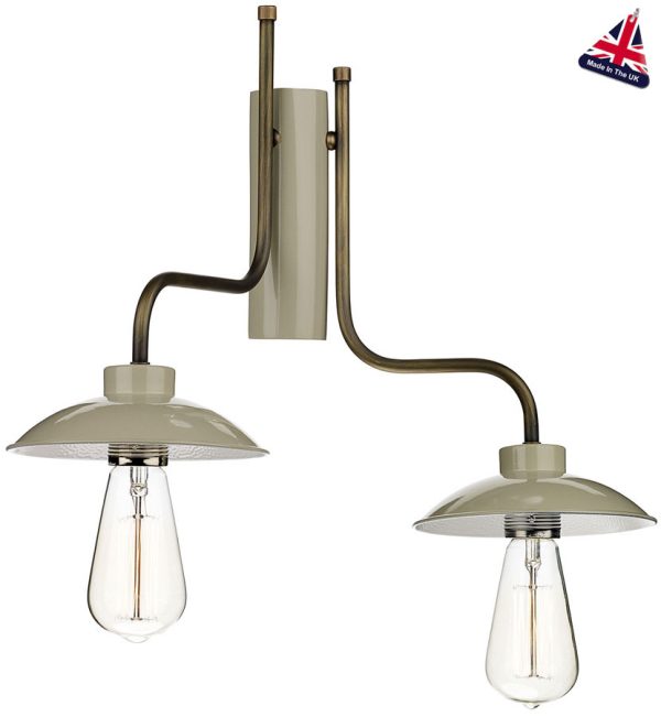 A contemporary wall light constructed from solid brass, with a French cream half cylinder wall mount and two curved lamp support arms set at various heights. Each arm holds a cream painted finish downward facing brim shade and polished chrome lamp holder to complete the stylish design.