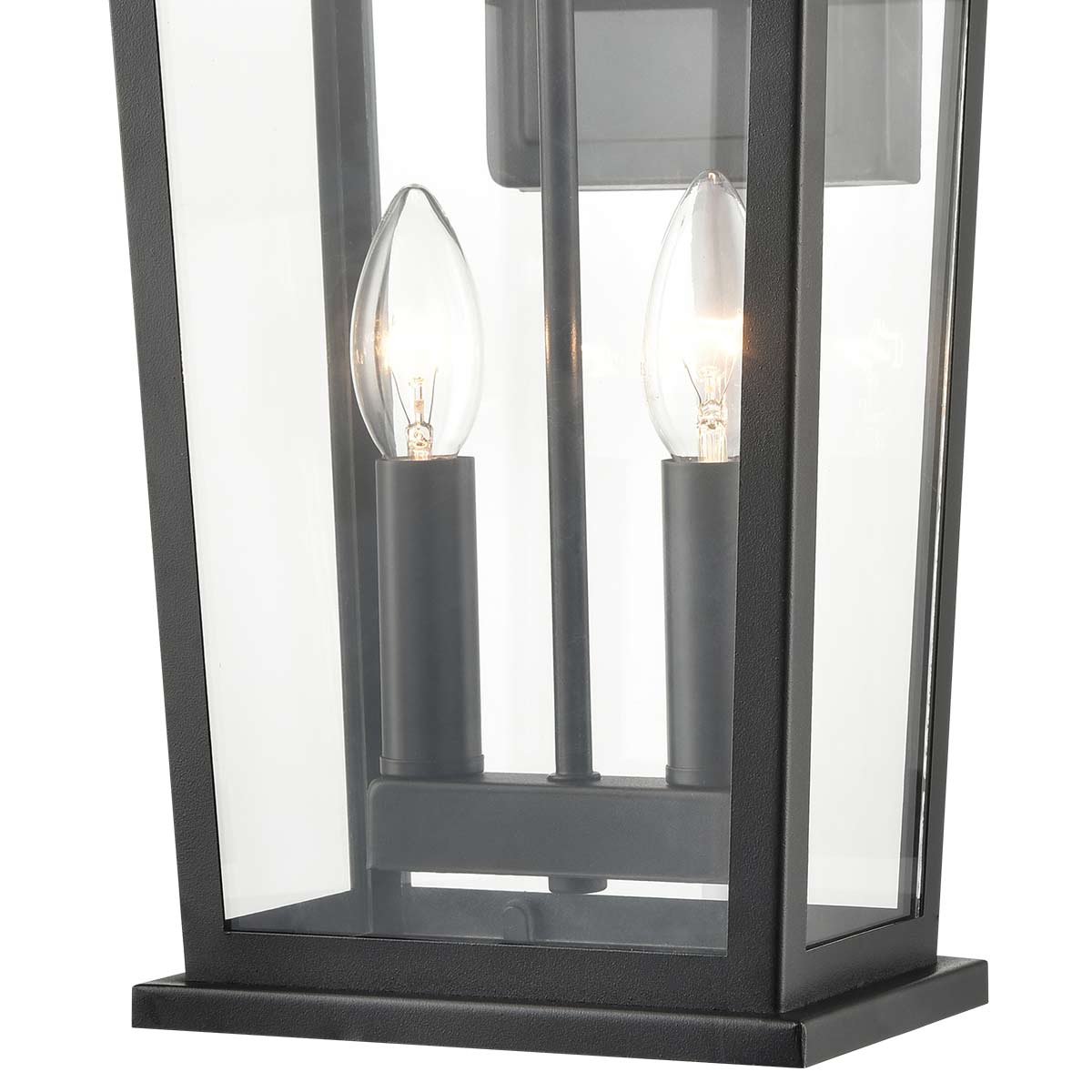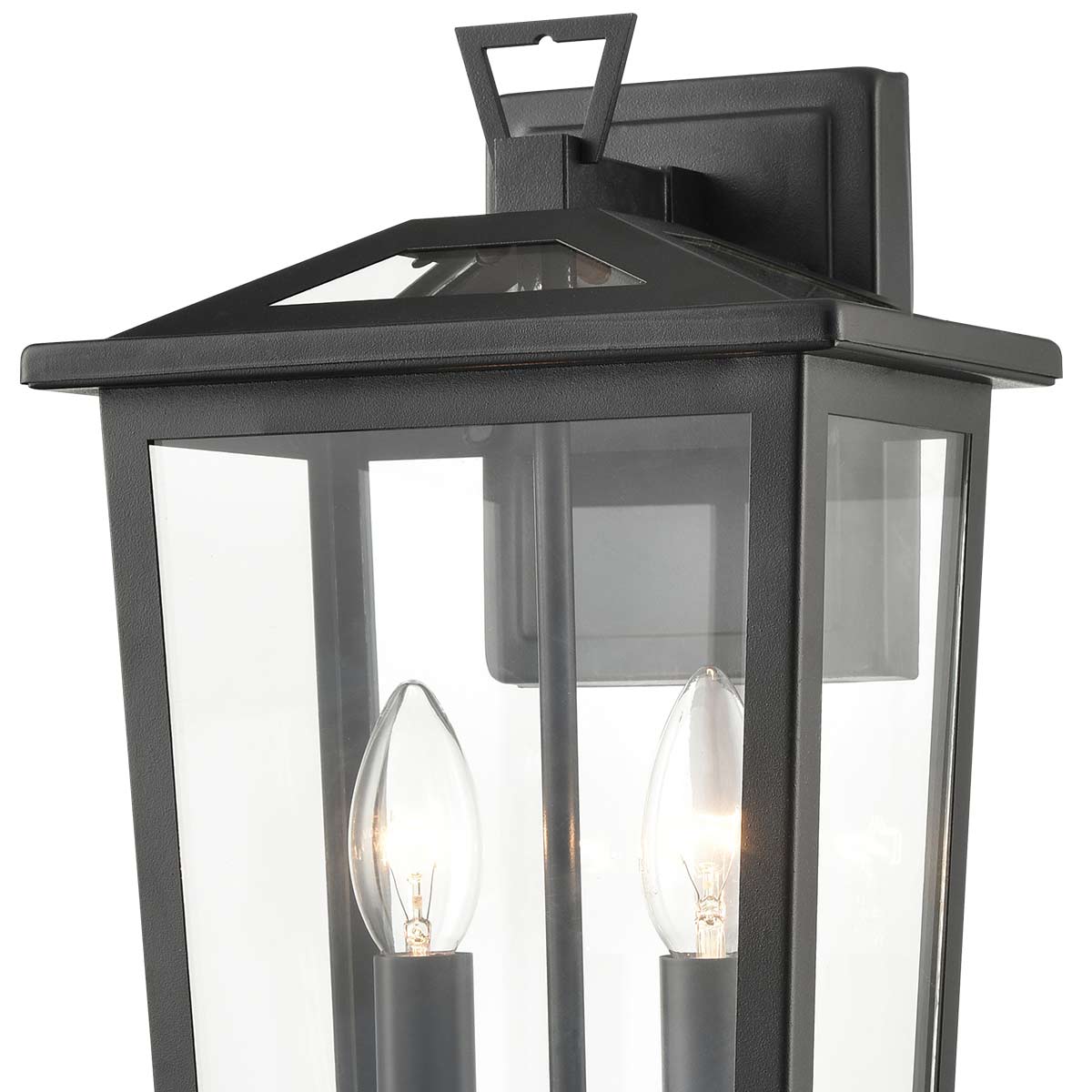 Featuring a modern take on the classic wall lantern, the Dusk 2 light exterior wall lantern in matt black with clear glass panels and rated IP44 by Franklite. The perfect addition to patios, pathways and entrance doors, it features clean lines, powder coated steel construction and glass panels in the roof and lantern body. Two candle style lights produce a bright, all round light.