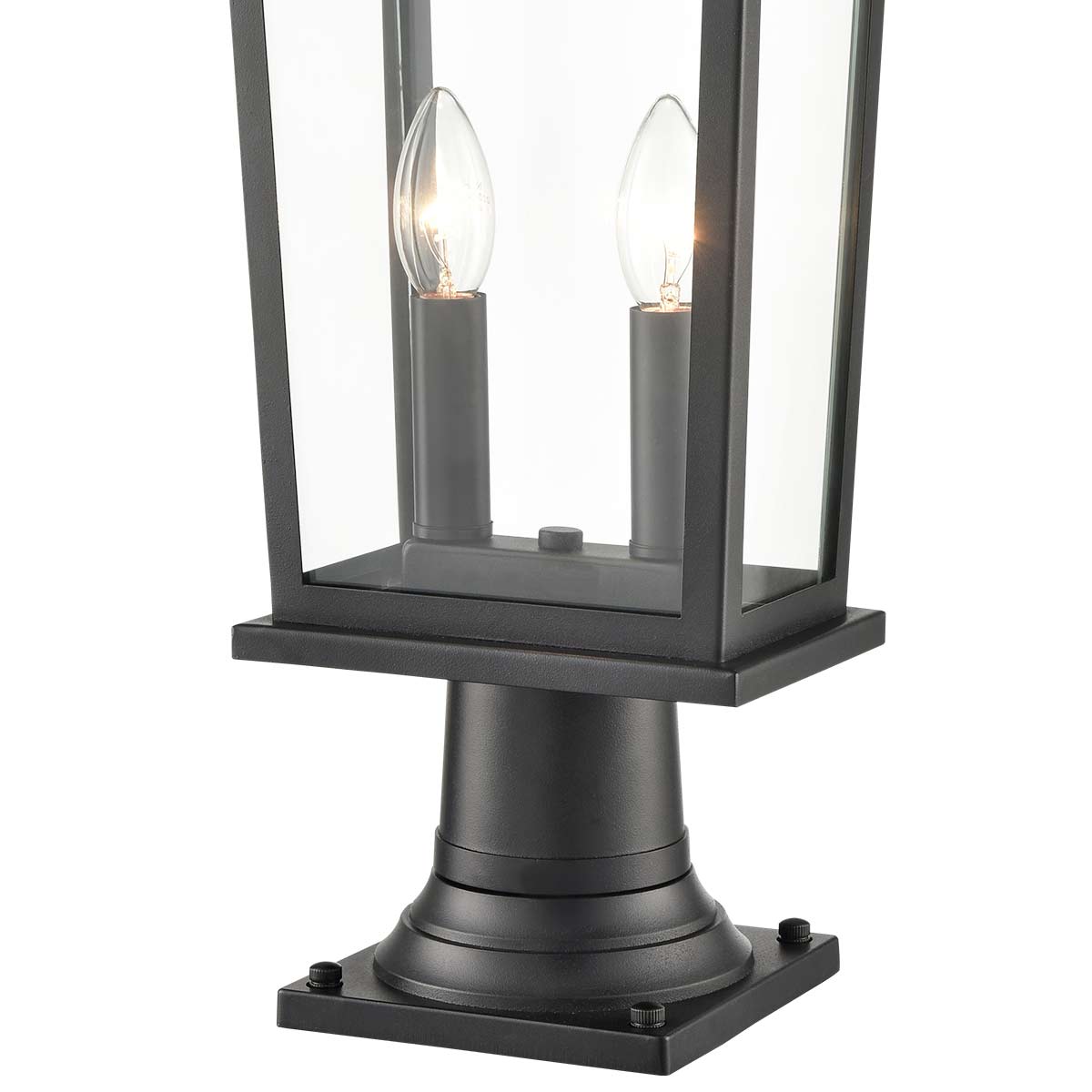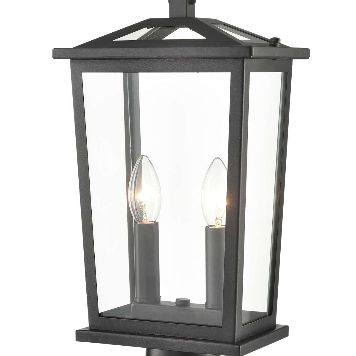 Featuring a modern take on the classic post light, the small Dusk 2 light modern outdoor pedestal lantern in matt black with clear glass panels and rated IP44 by Franklite. The perfect addition to gateposts, a low garden wall or patio, it features clean lines, powder coated steel construction and glass panels in the roof and lantern body. Two candle style lights produce a bright, all round light.