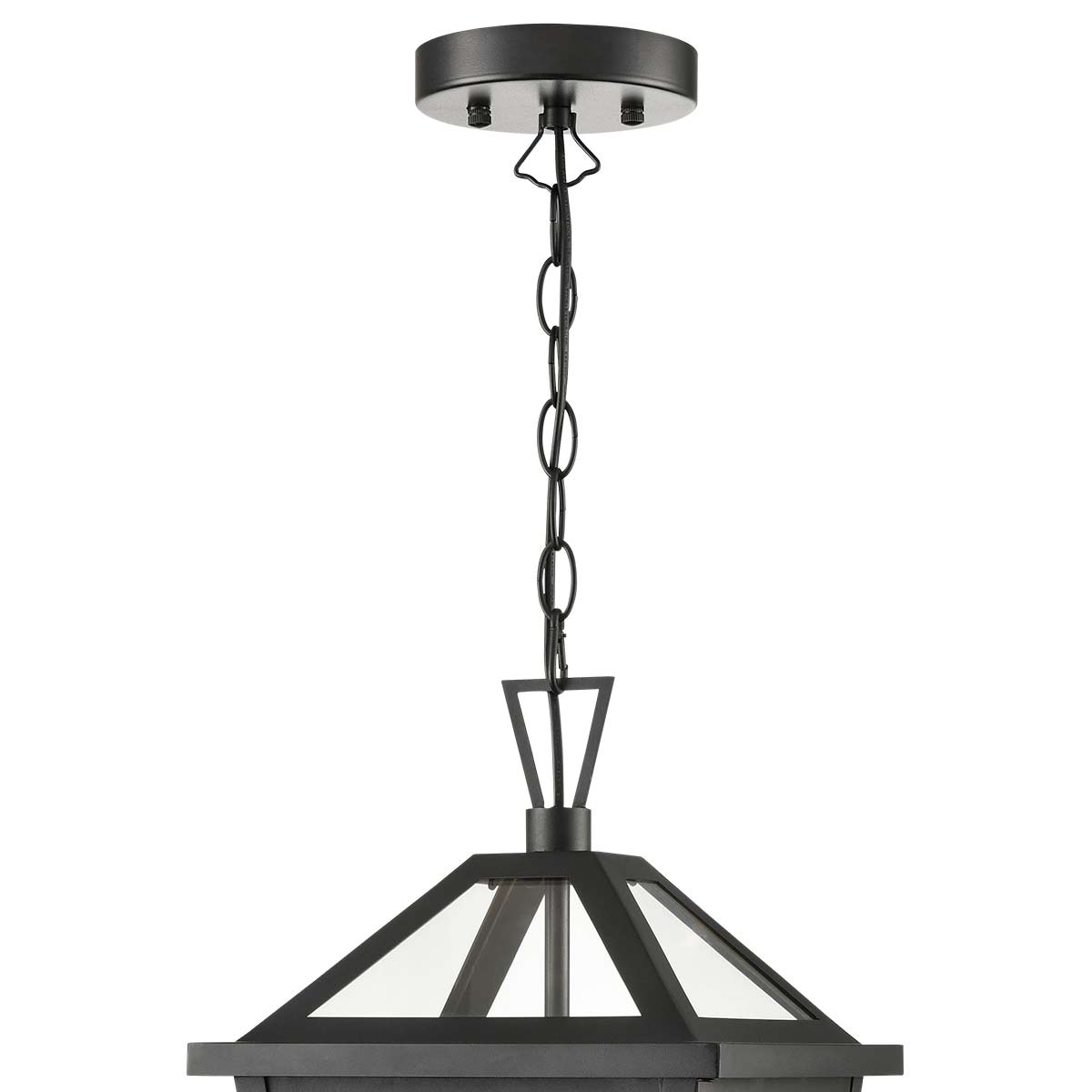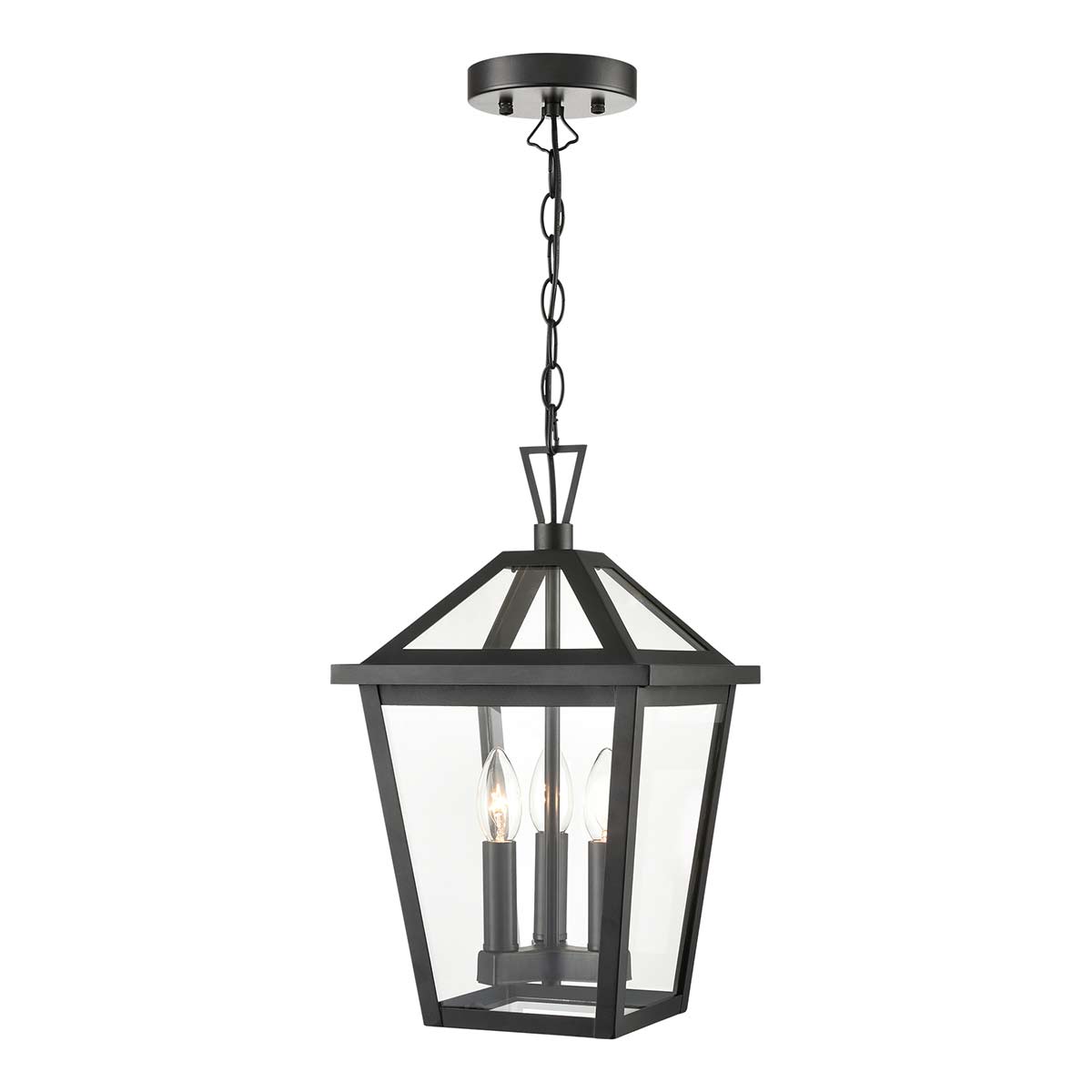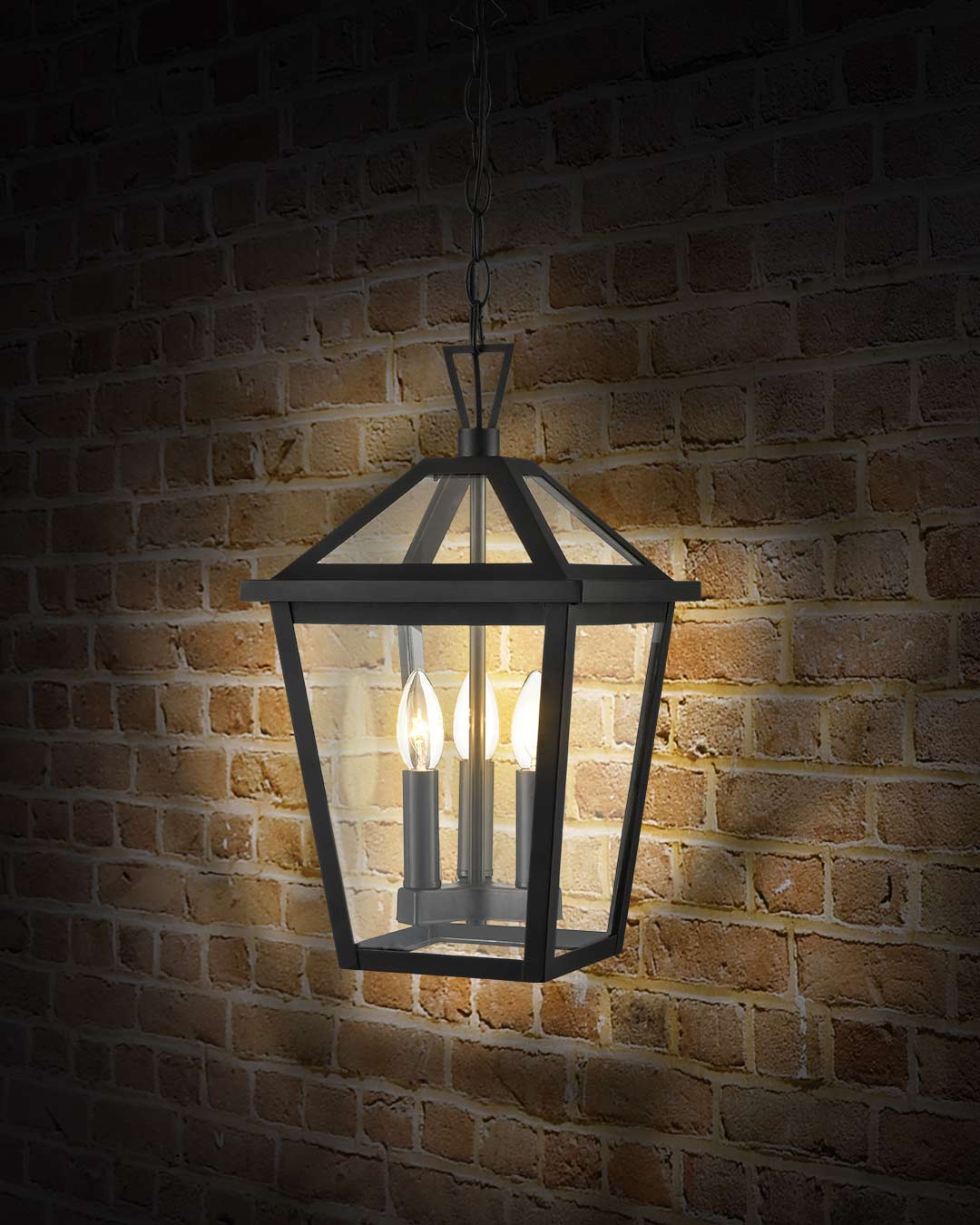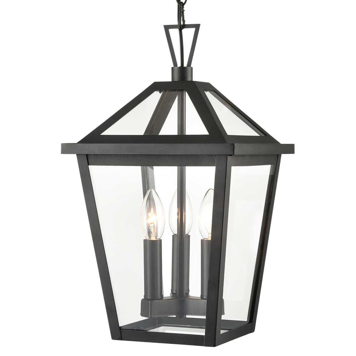 Featuring a modern take on the classic chain lantern, the Dusk 3 light hanging outdoor porch lantern in matt black with clear glass panels and rated IP44 by Franklite. The perfect addition to an exterior porch or covered terrace, it features clean lines, powder coated steel construction and glass panels in the roof and lantern body. Three candle style lights produce a bright, all round light.