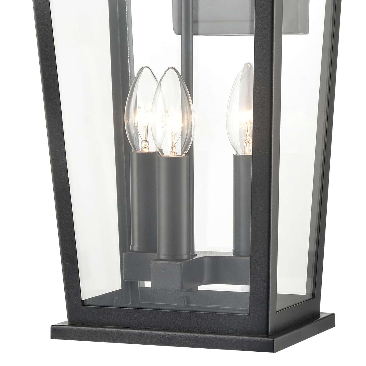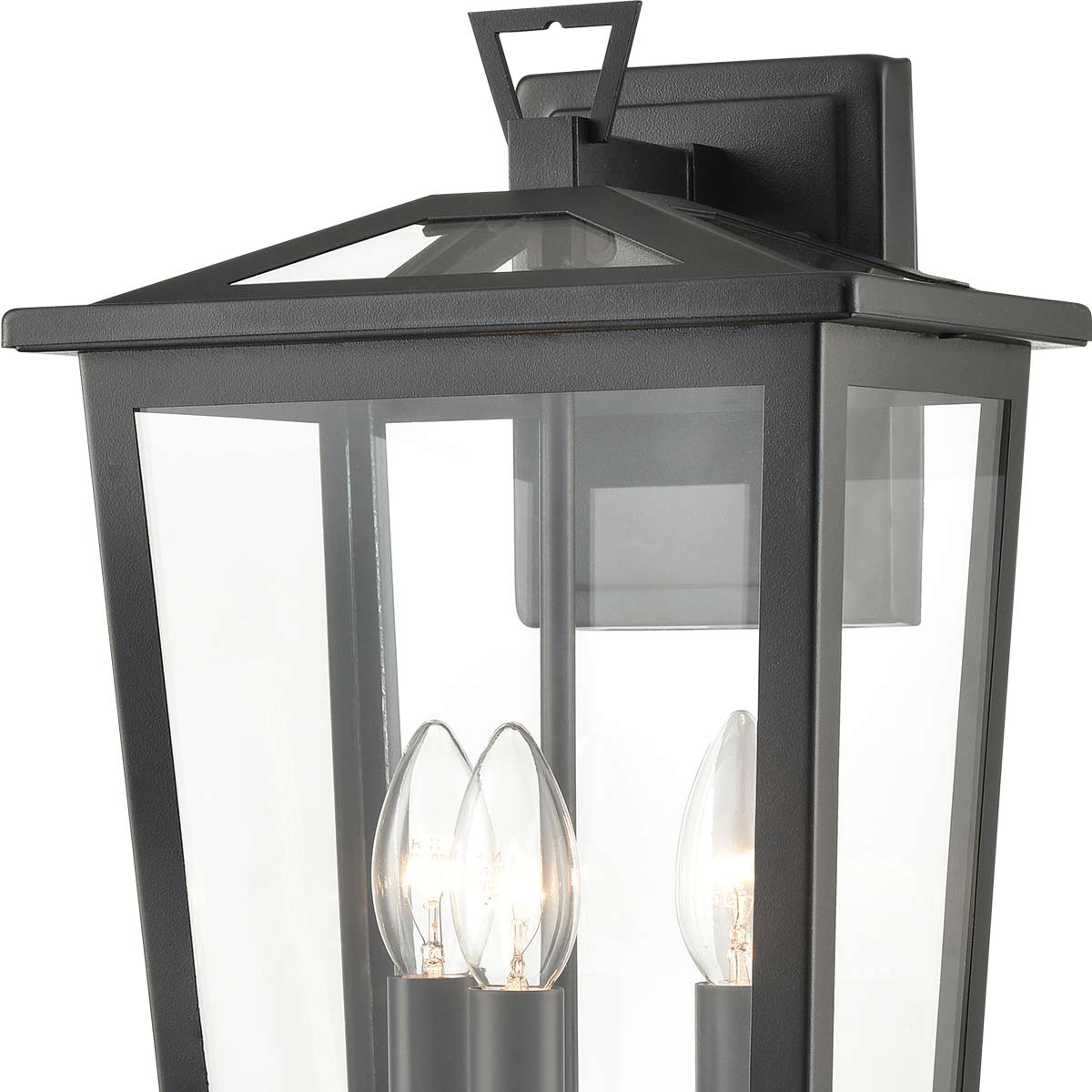 Featuring a modern take on the classic wall lantern, the Dusk 3 light outdoor wall lantern in matt black with clear glass panels and rated IP44 by Franklite. The perfect addition to patios, pathways and entrance doors, it features clean lines, powder coated steel construction and glass panels in the roof and lantern body. Three candle style lights produce a bright, all round light.