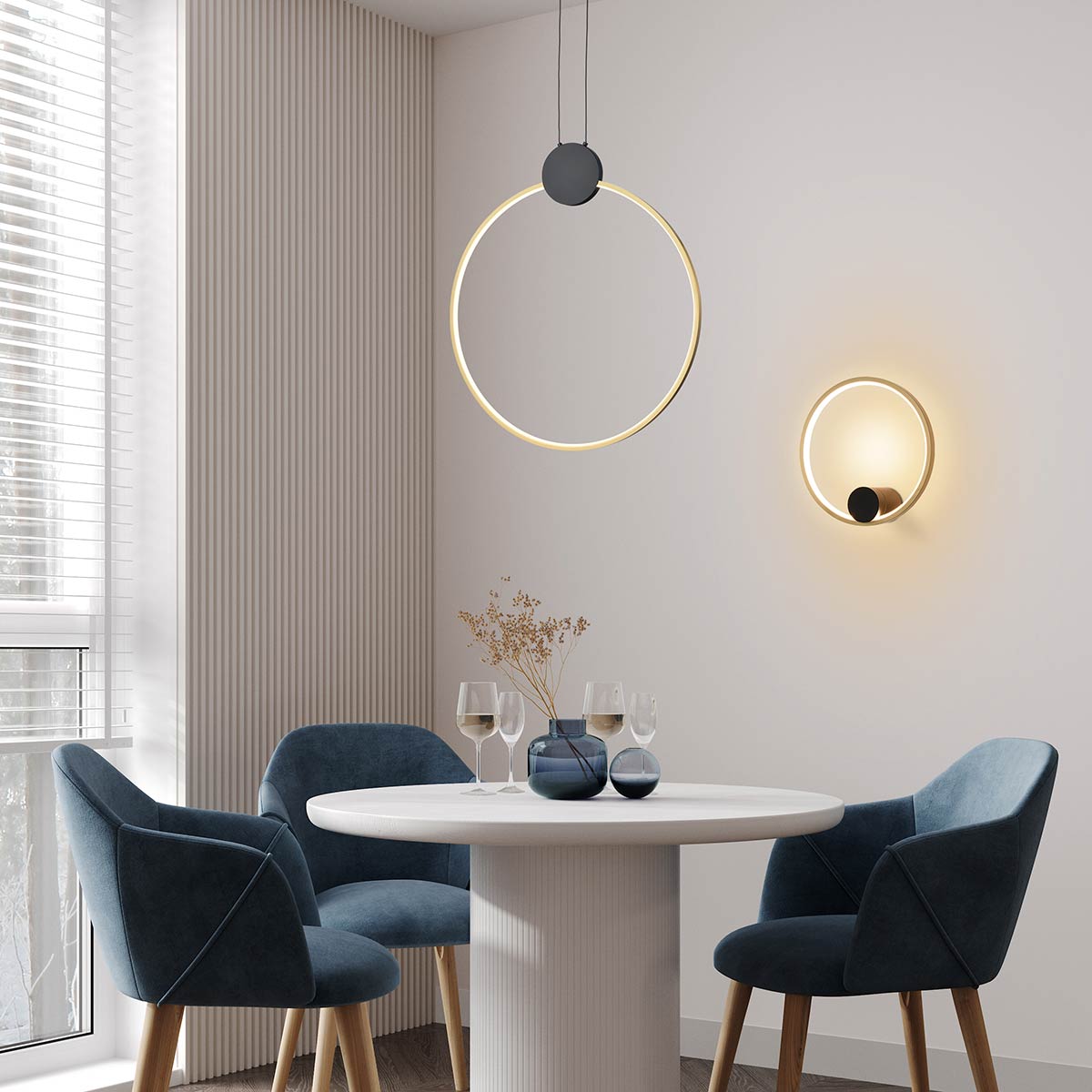 The Eclipse 20W black and gold LED ring ceiling pendant by Franklite brings minimalist contemporary style to any room. A 500mm diameter gold finish ring hangs from a matt black ceiling mount and circular support. The ring is lined with 20W of warm white dimmable LEDs, creating 960 lumens of wonderful diffused light.