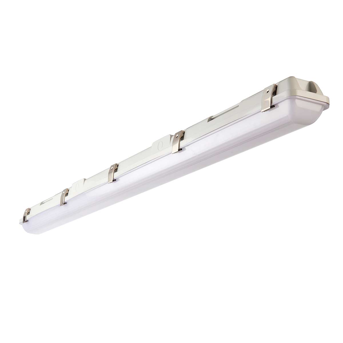 This Endura 4ft CCT LED anti-corrosive single batten with dual 19 and 30W power options is rated IP65. Constructed from polycarbonate with grey body, frosted diffuser and stainless anti-tamper clips, this high lumen fluorescent style fitting is shock and impact resistant and IK08 rated. The CCT technology gives you the option of 3000K, 4000K and 6500K.
