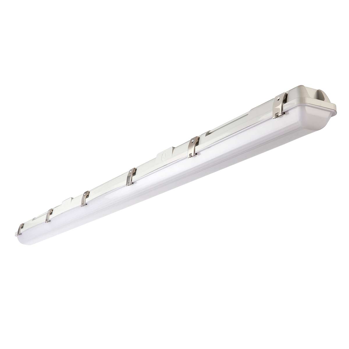 This Endura 5ft CCT LED anti-corrosive single batten with dual 24 and 50W power options is rated IP65. Constructed from polycarbonate with grey body, frosted diffuser and stainless anti-tamper clips, this high lumen fluorescent style fitting is shock and impact resistant and IK08 rated. The CCT technology gives you the option of 3000K, 4000K and 6500K.