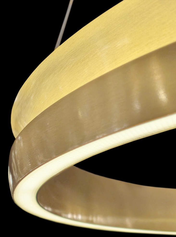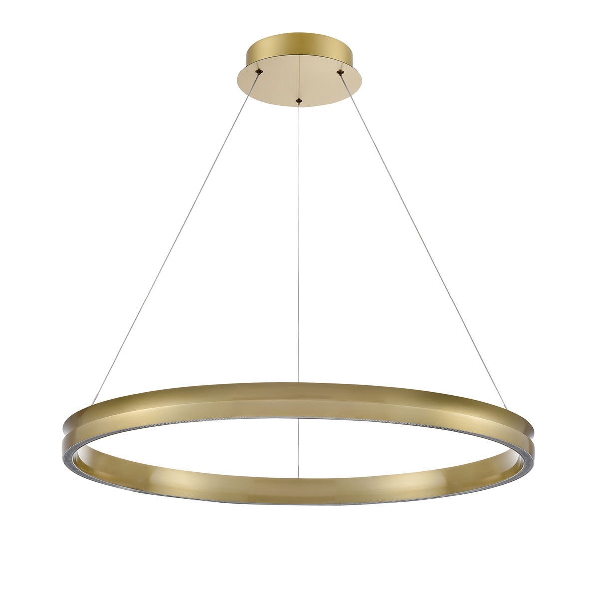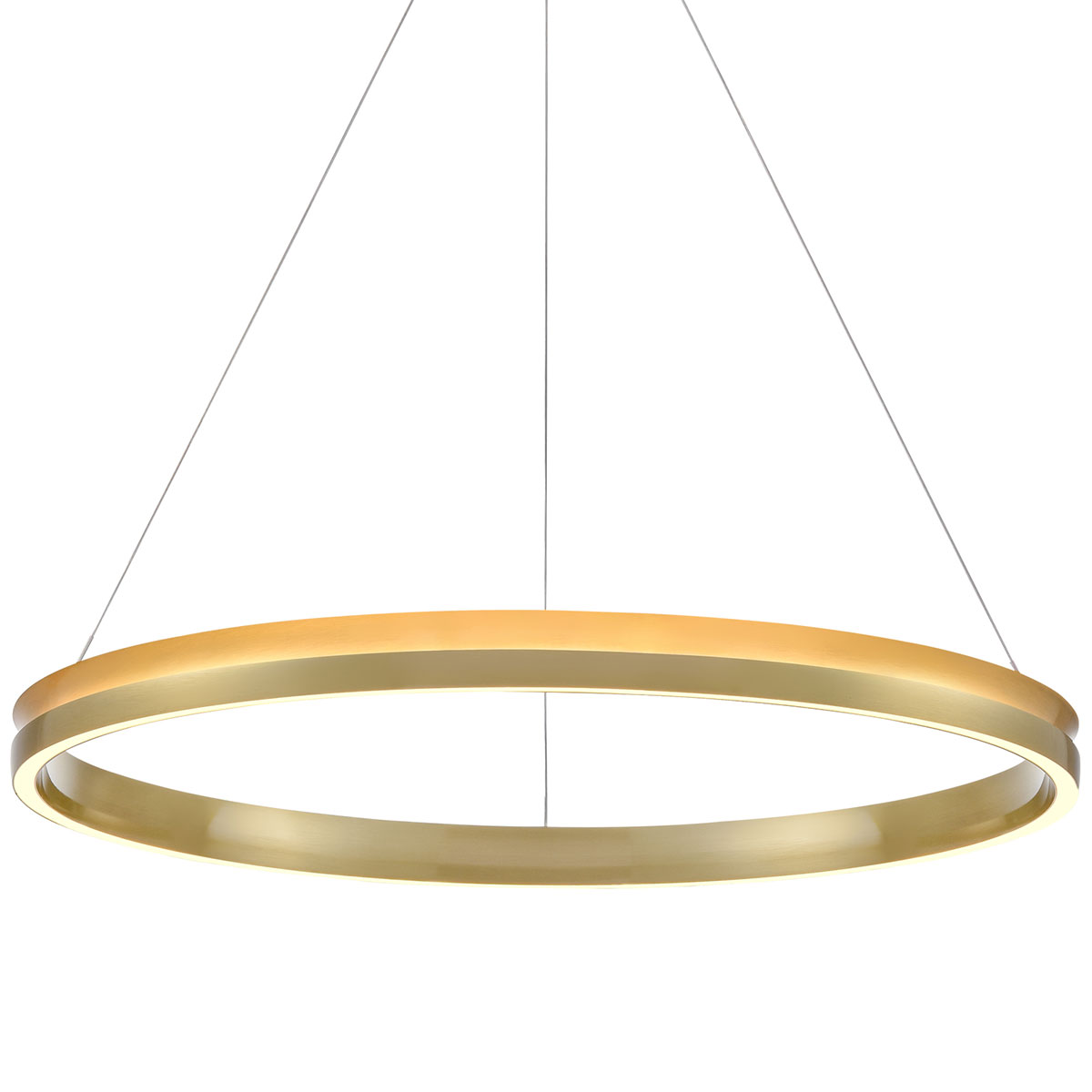 The Eternity large satin brass LED ceiling pendant ring by Franklite brings minimalist contemporary style to any room. A 800mm diameter sculpted circle hangs by fine wires from a satin brass finish ceiling mount. The integral warm white dimmable LEDs shine through the top and bottom, creating a wonderful diffused light.