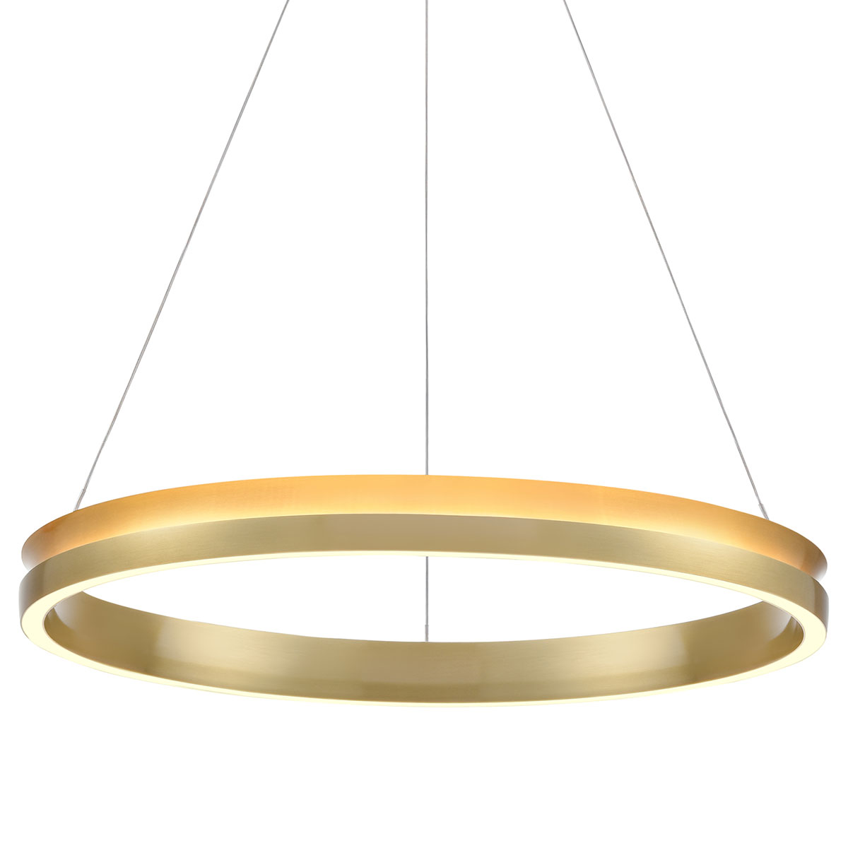 The Eternity small satin brass LED ceiling pendant ring by Franklite brings minimalist contemporary style to any room. A 600mm diameter sculpted circle hangs by fine wires from a satin brass finish ceiling mount. The integral warm white dimmable LEDs shine through the top and bottom, creating a wonderful diffused light.